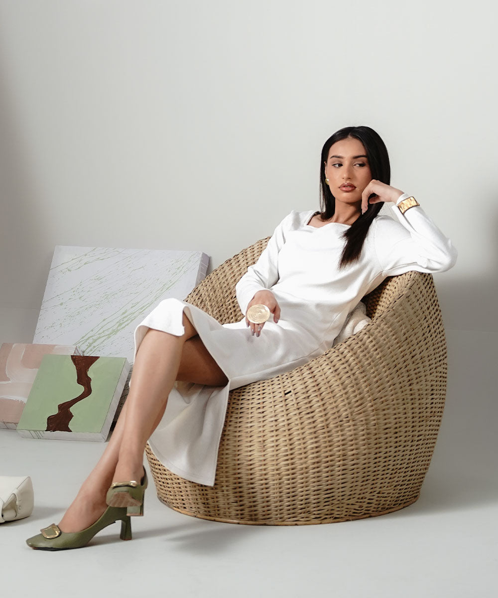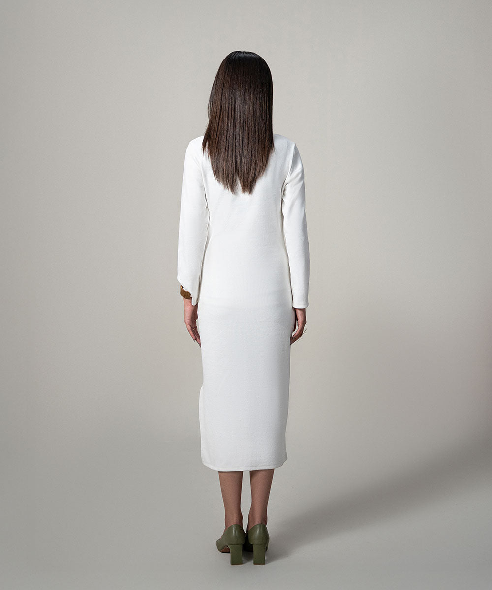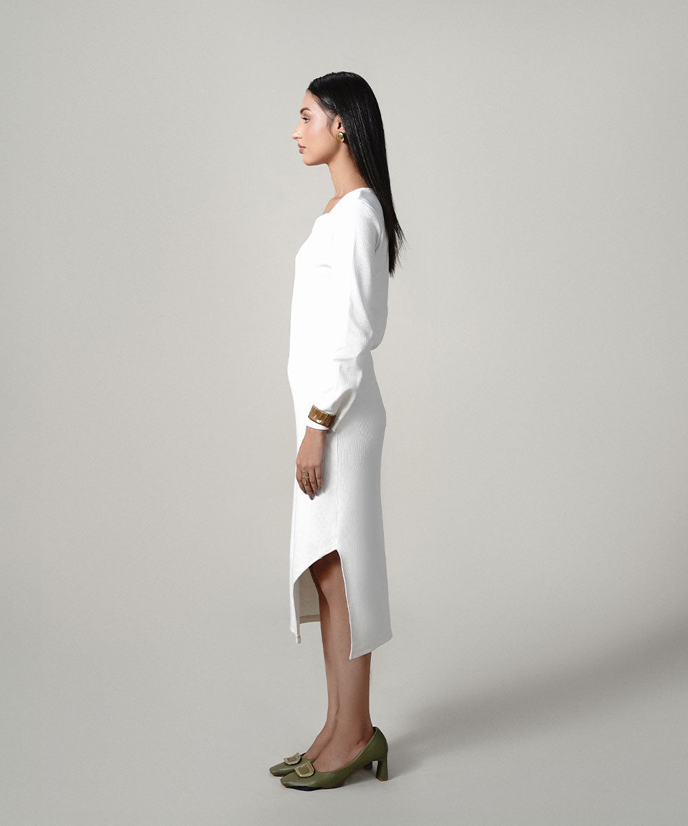 Design details: Minimalist white long dress featuring ribbed texture, side slit, and streamlined silhouette.