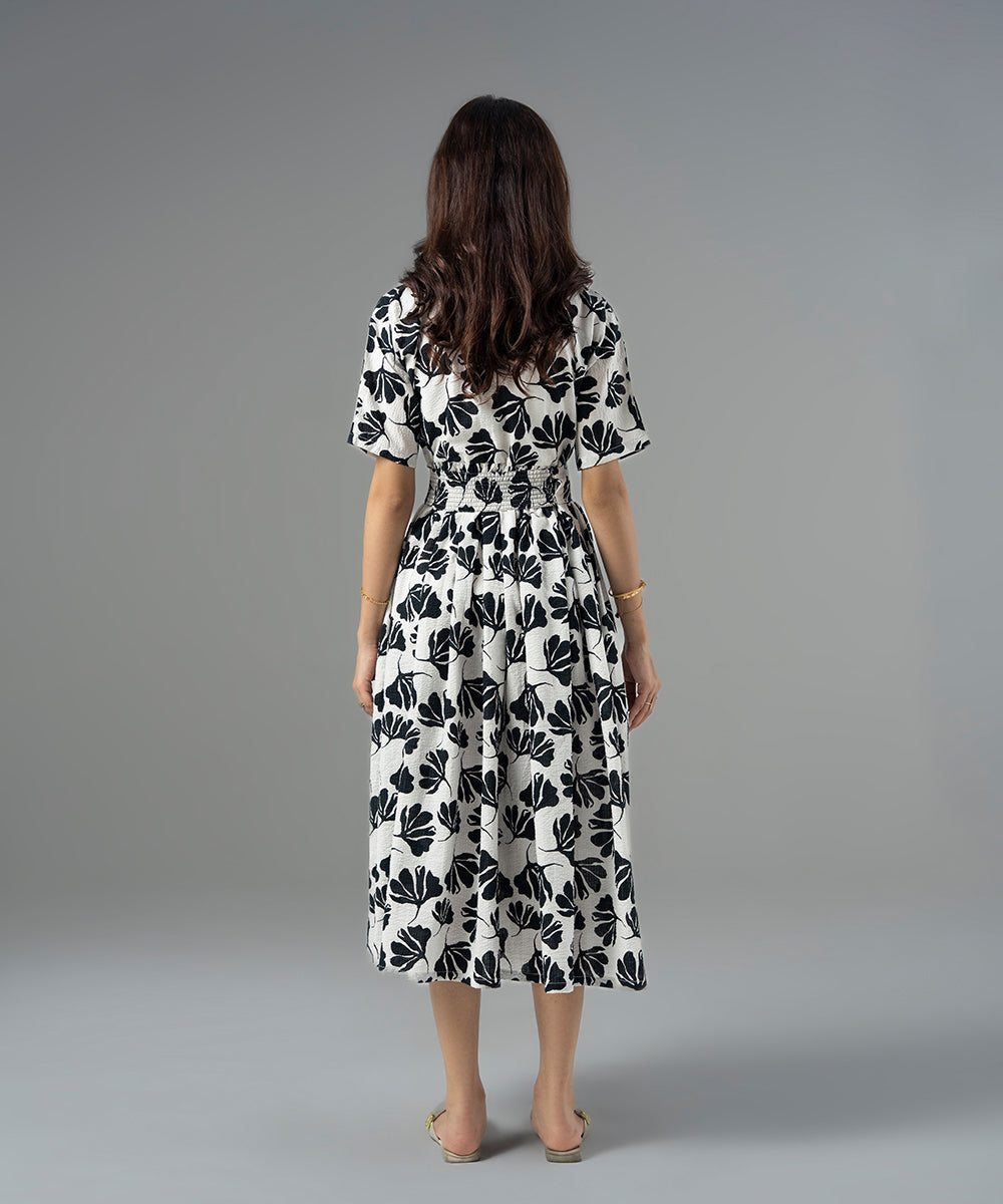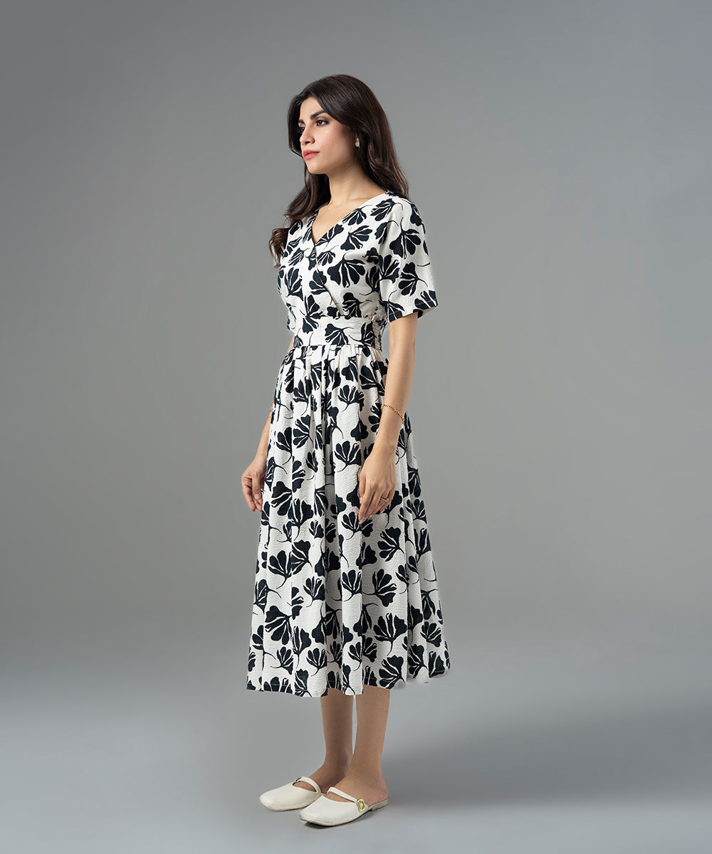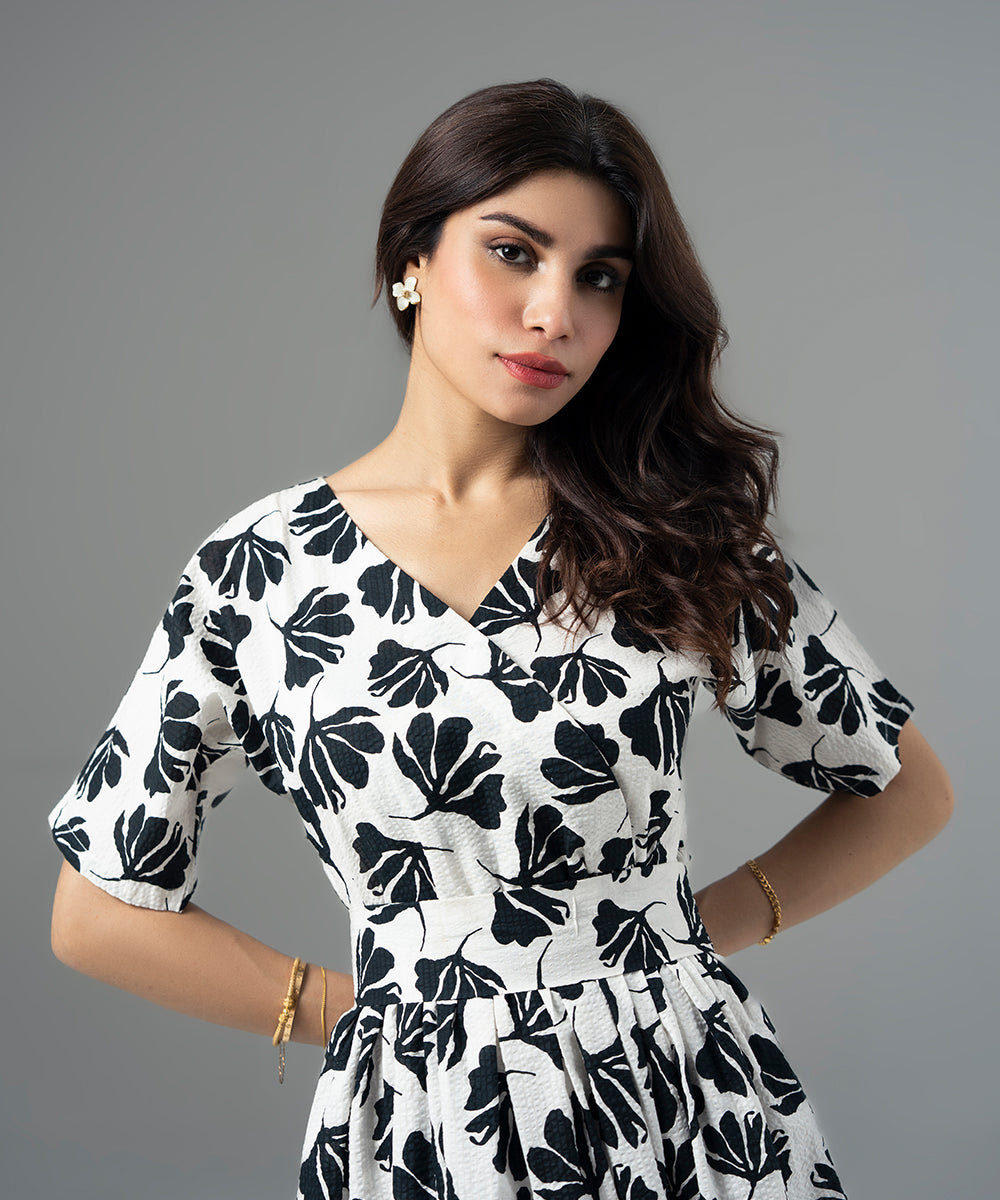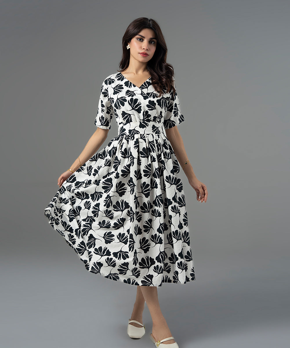Design details: Gorgeous self jacquard frock featuring long sleeves, side tie detailing & square neckline making it suitable for both daytime outings and evening events.