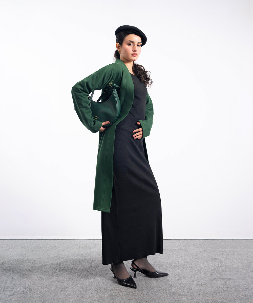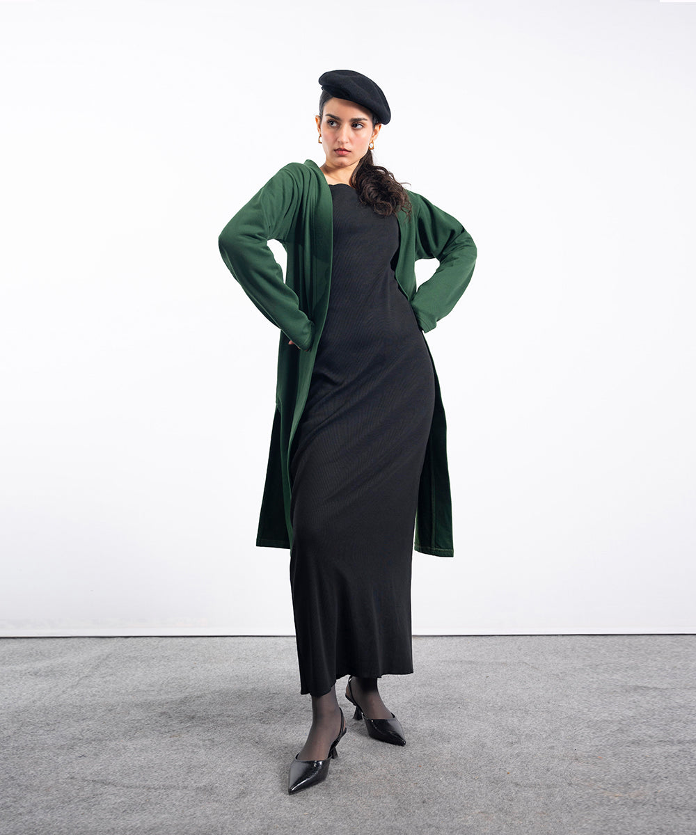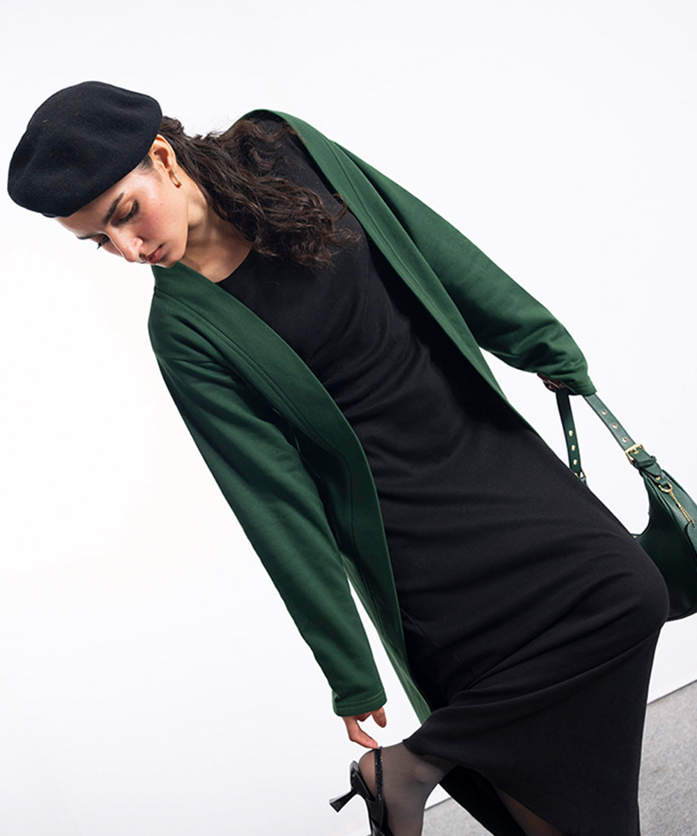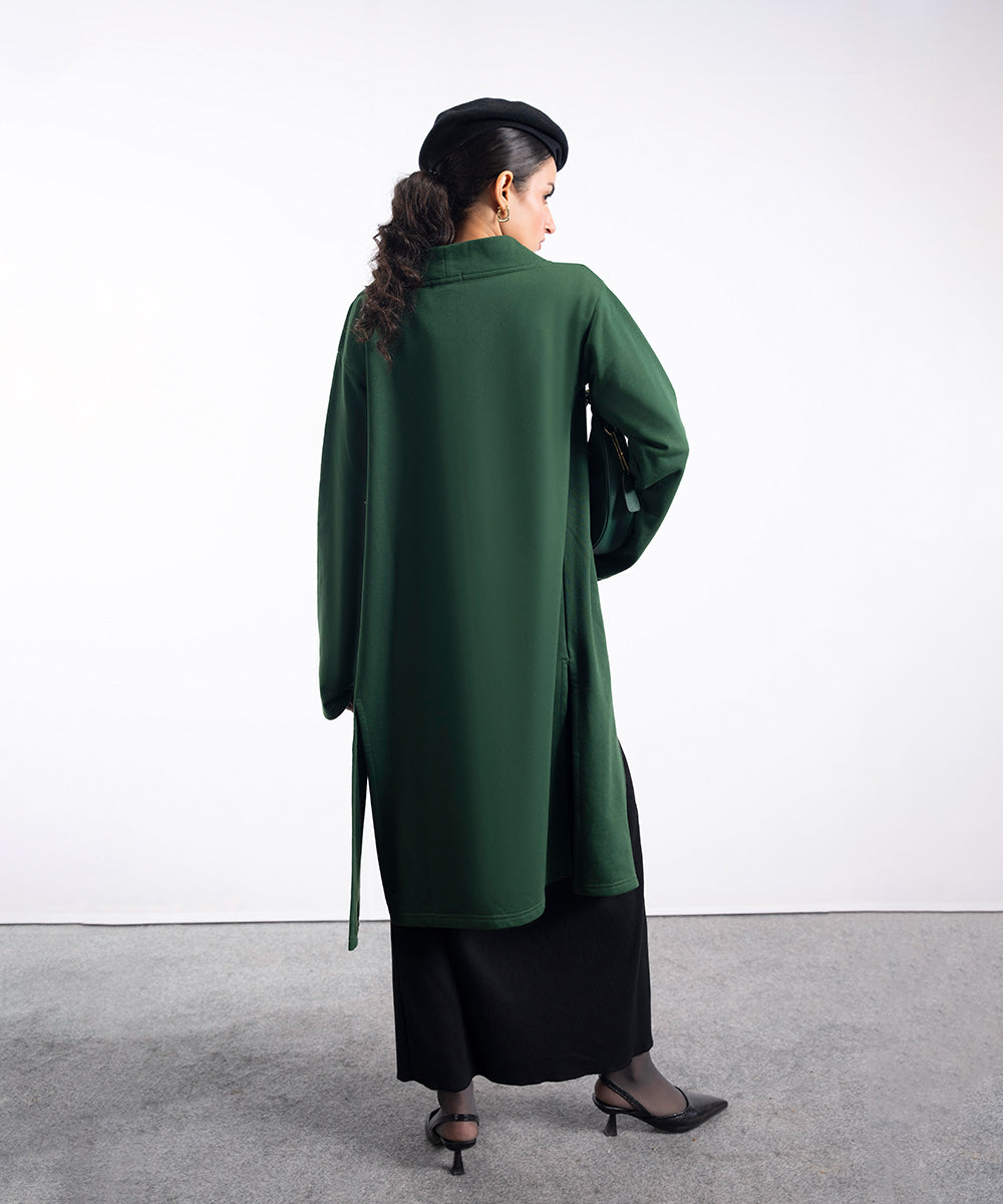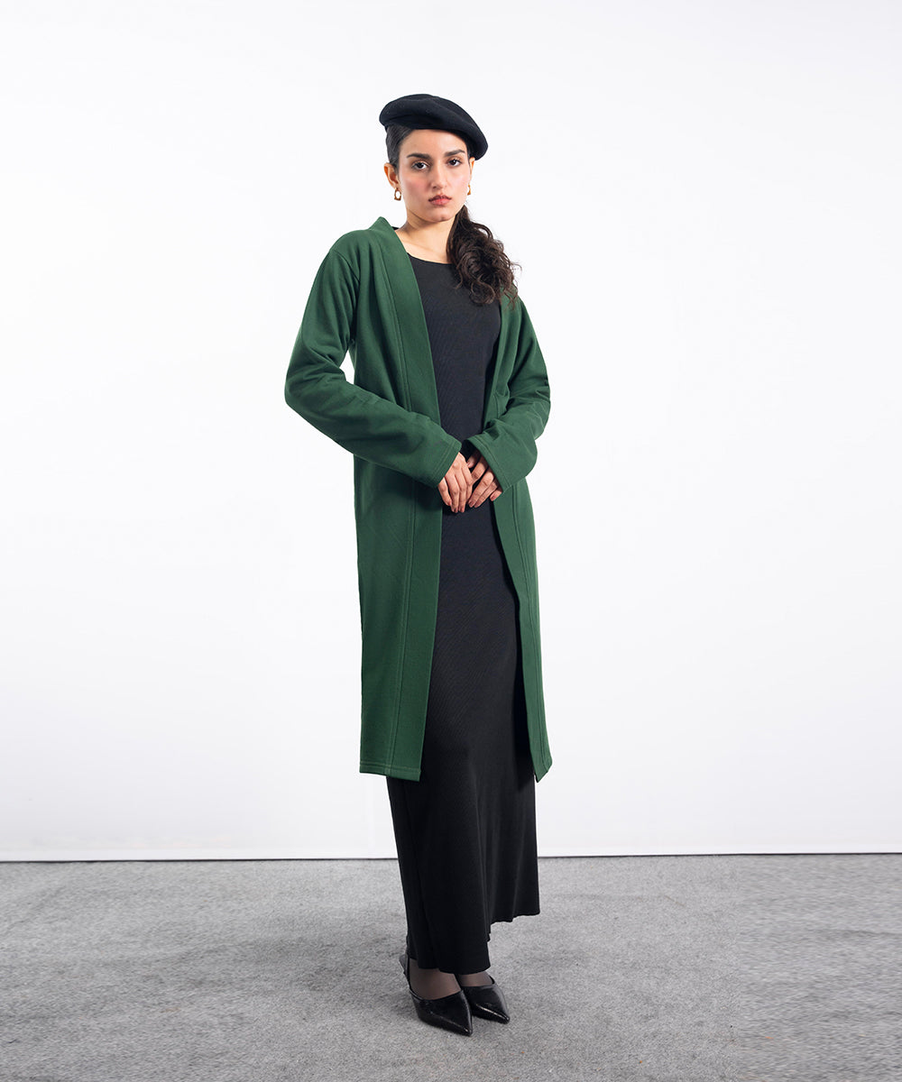 A long forest green fleece cardigan that combines elegance with functionality. Ideal as an outer layer, it provides warmth and style, making it a refined choice for layering over any outfit.