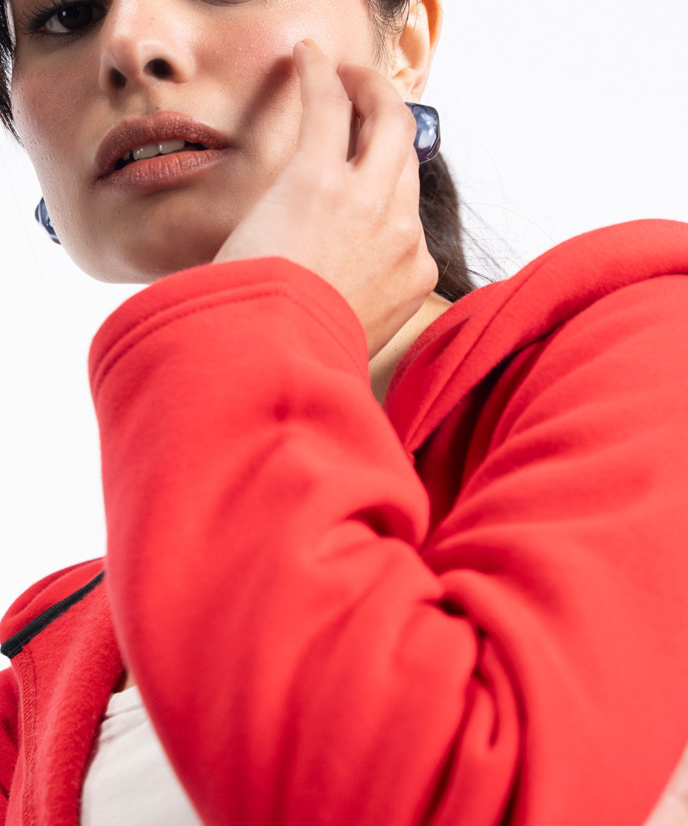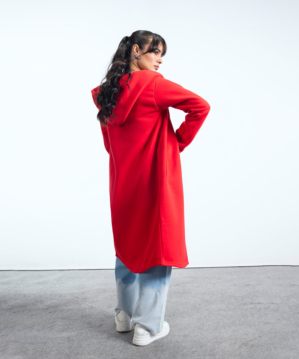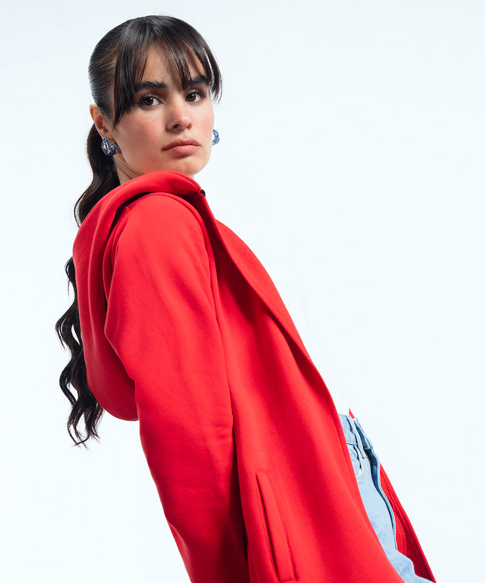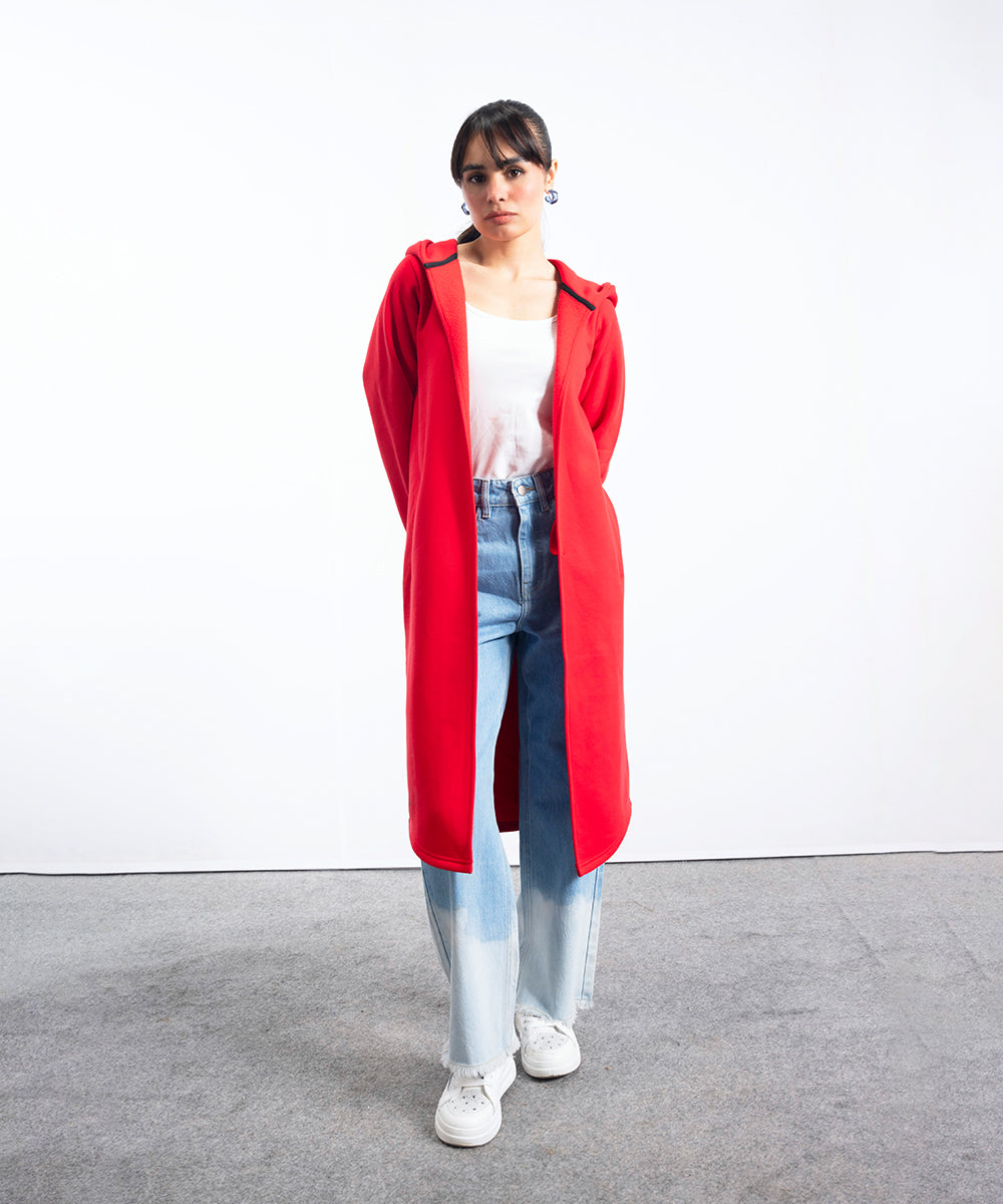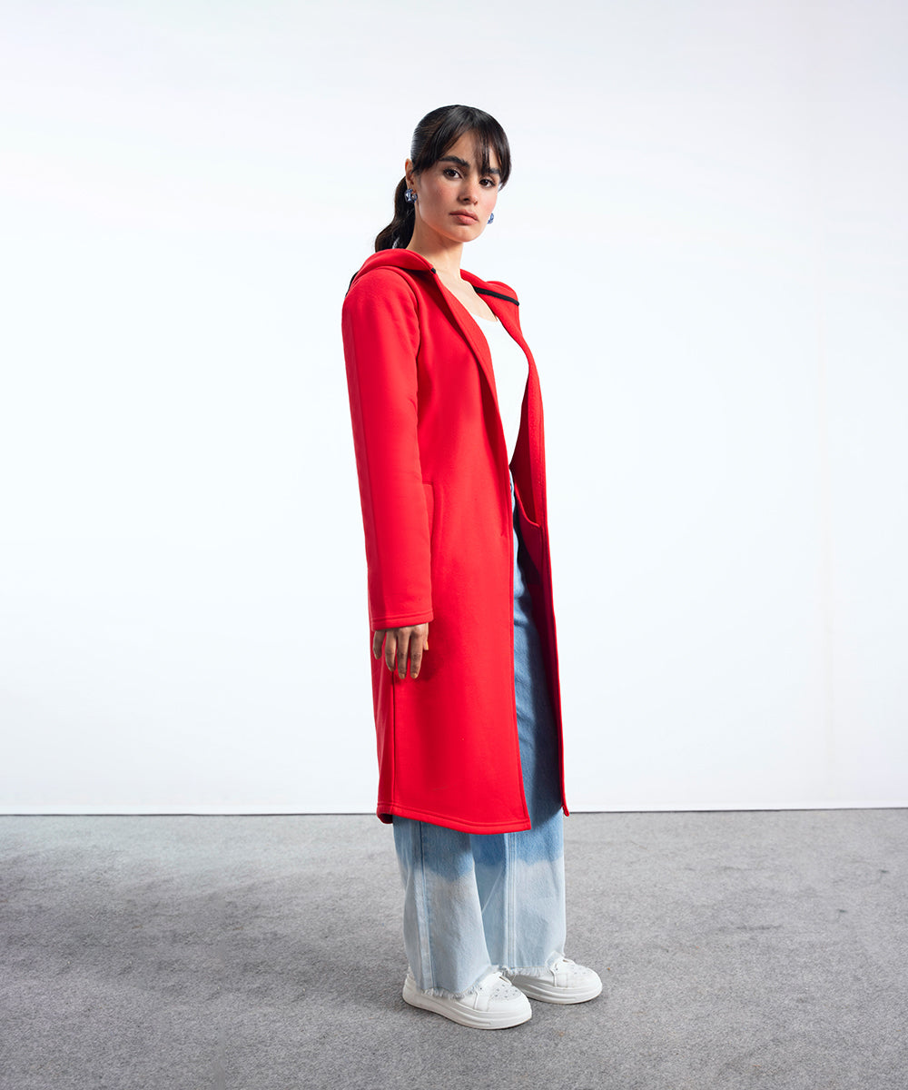 A stylish red fleece cardigan featuring a cozy hood and functional pockets. This classy design combines warmth and practicality, making it a perfect statement piece for versatile layering.