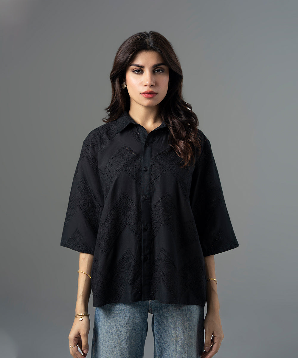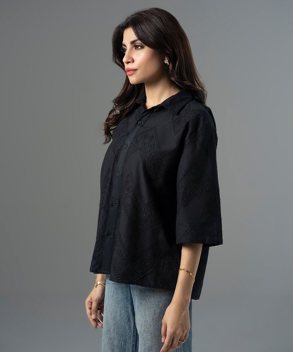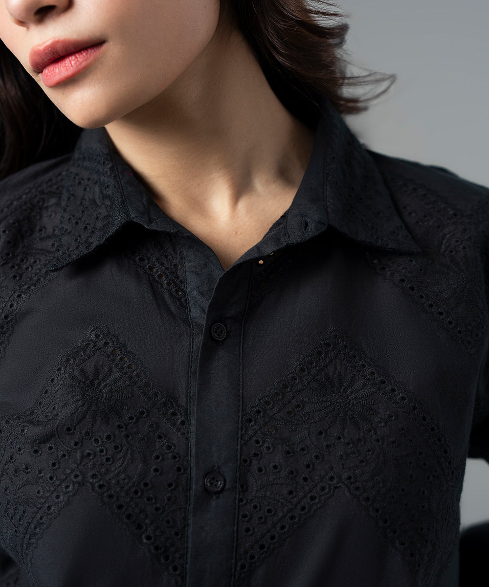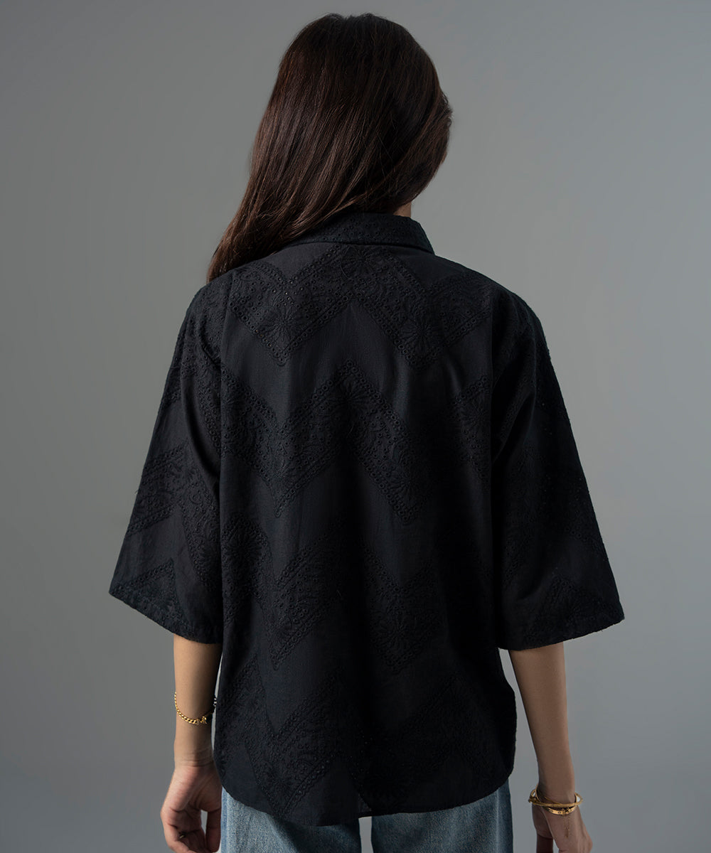 Design details: Crafted in deep black, this shirt blends modern tailoring with delicate heritage embroidery.