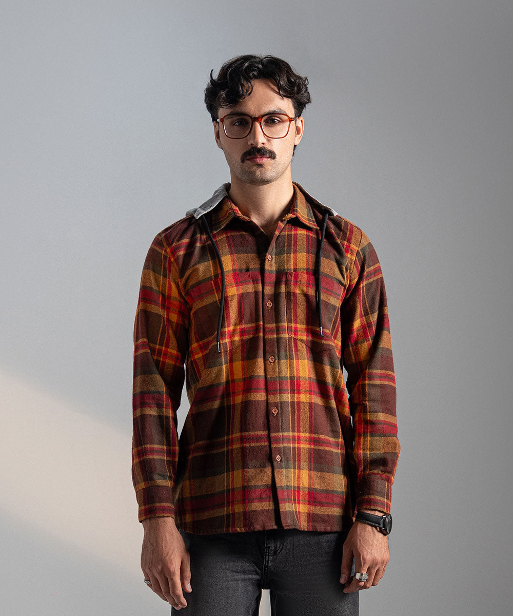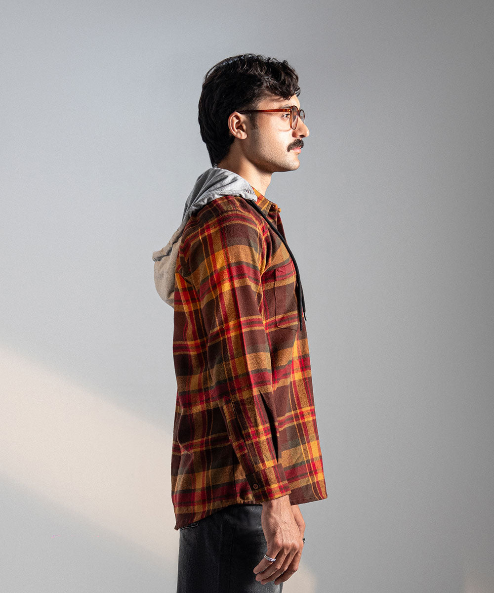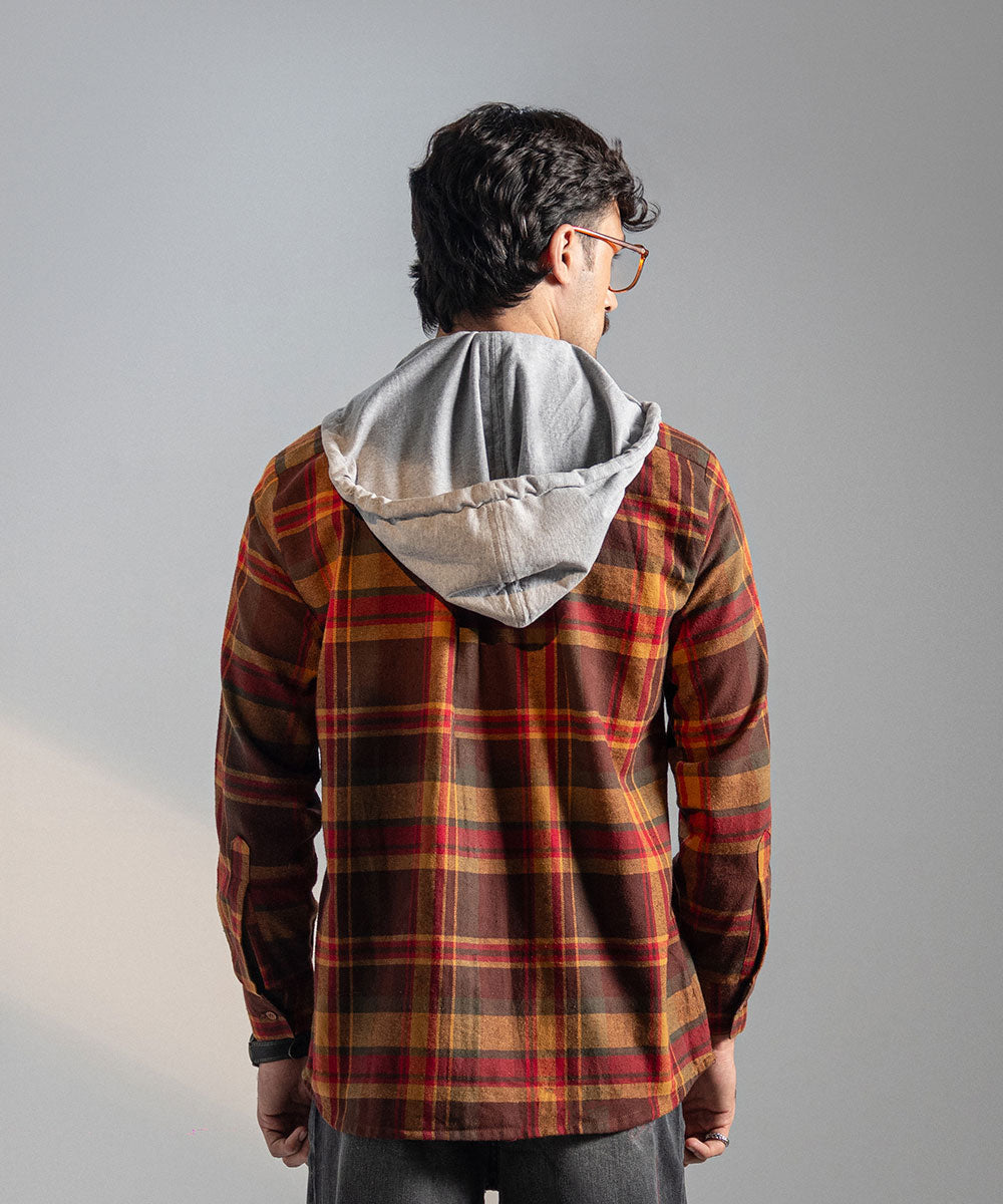 Design details: Core flannel hoodie in red and brown featuring detachable hood and comfortable relaxed fit.