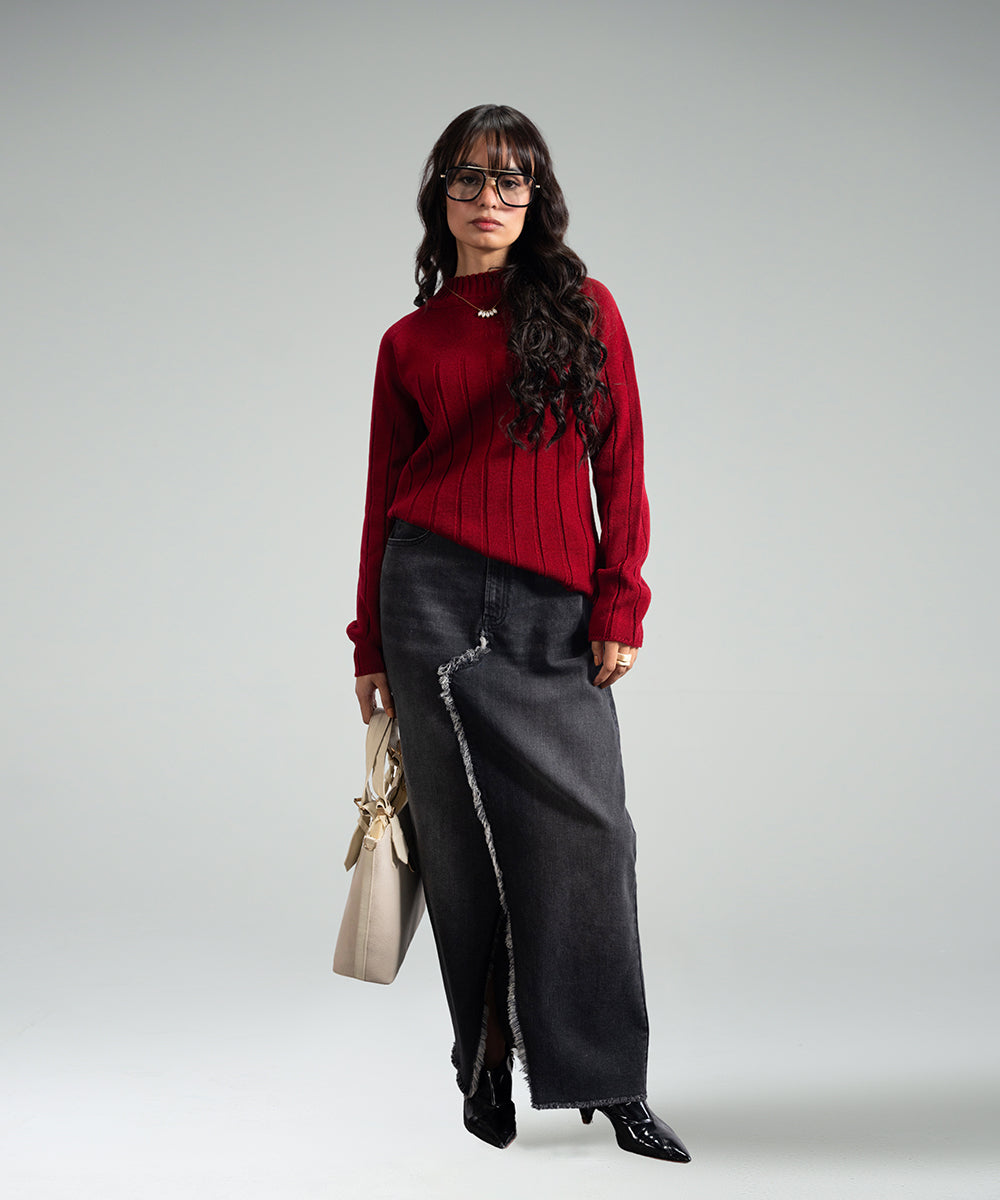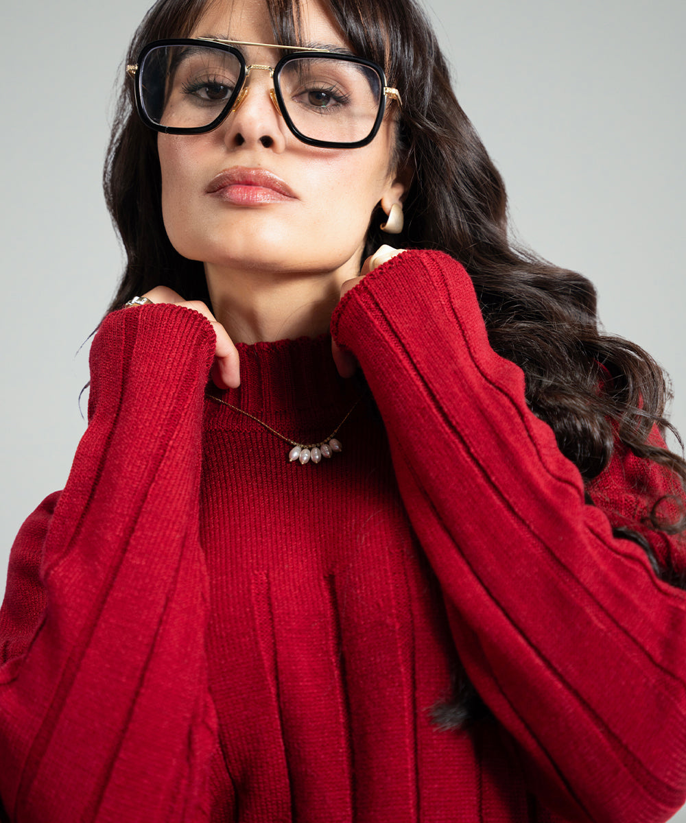 Design details: The red fitted turtleneck sweater features subtle self-textured lines, creating a dynamic look. Its bold color and sleek design make it a modern wardrobe essential.