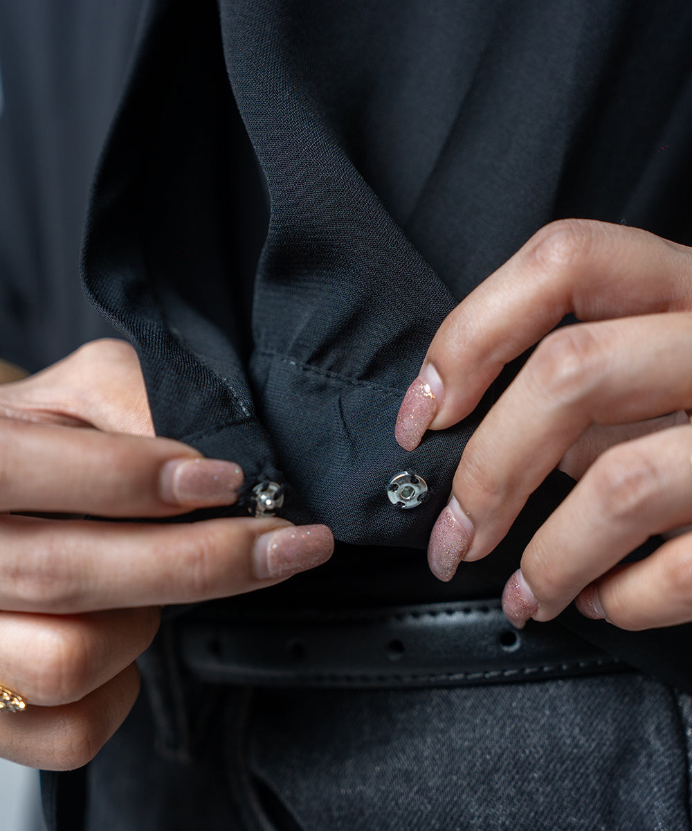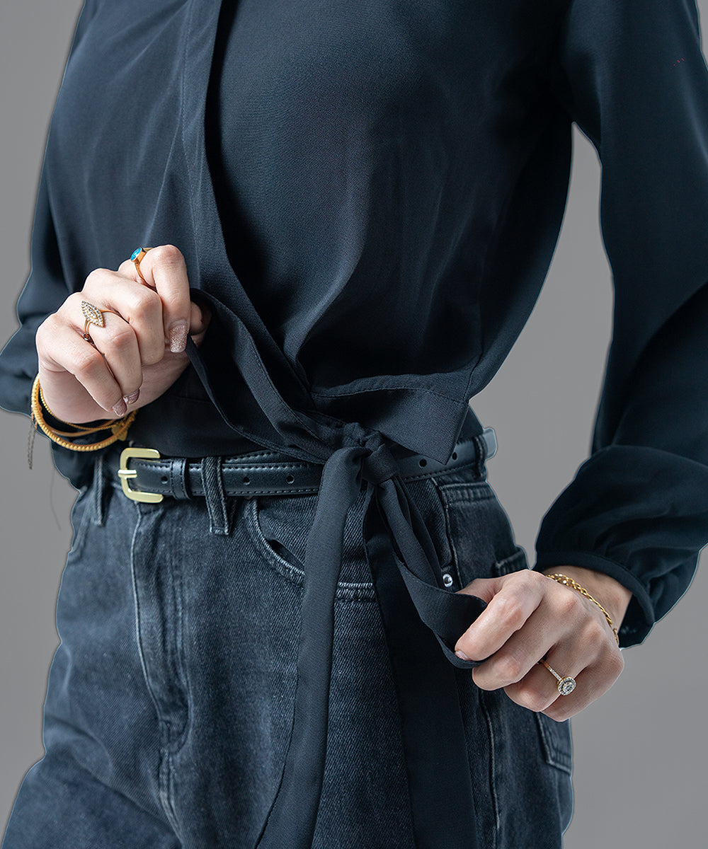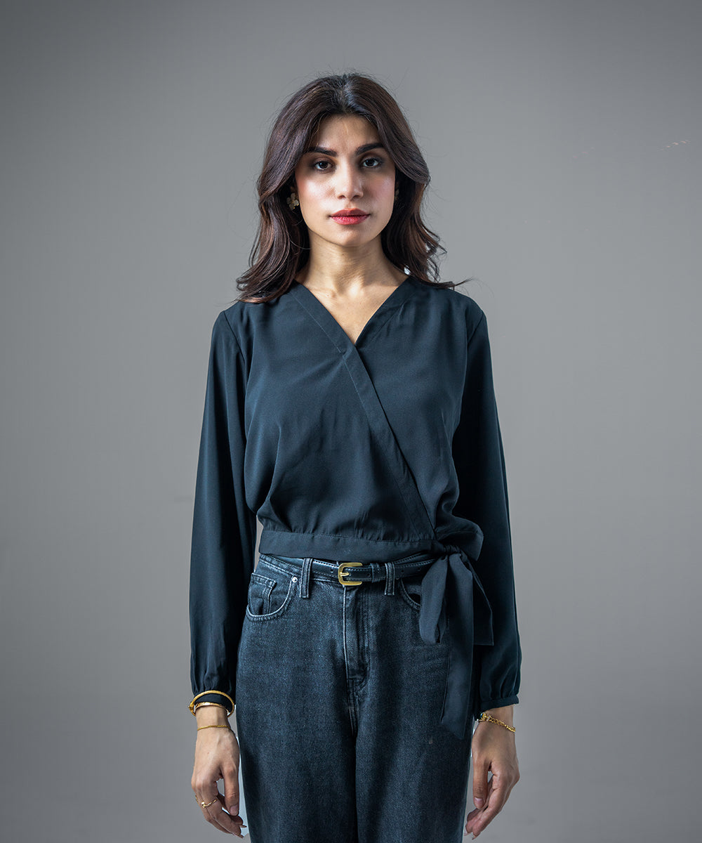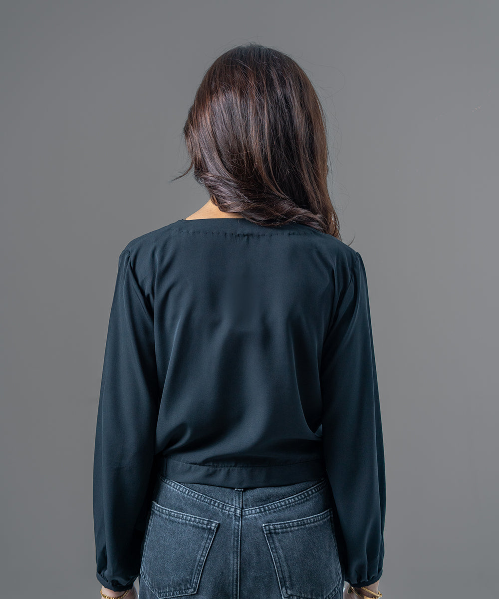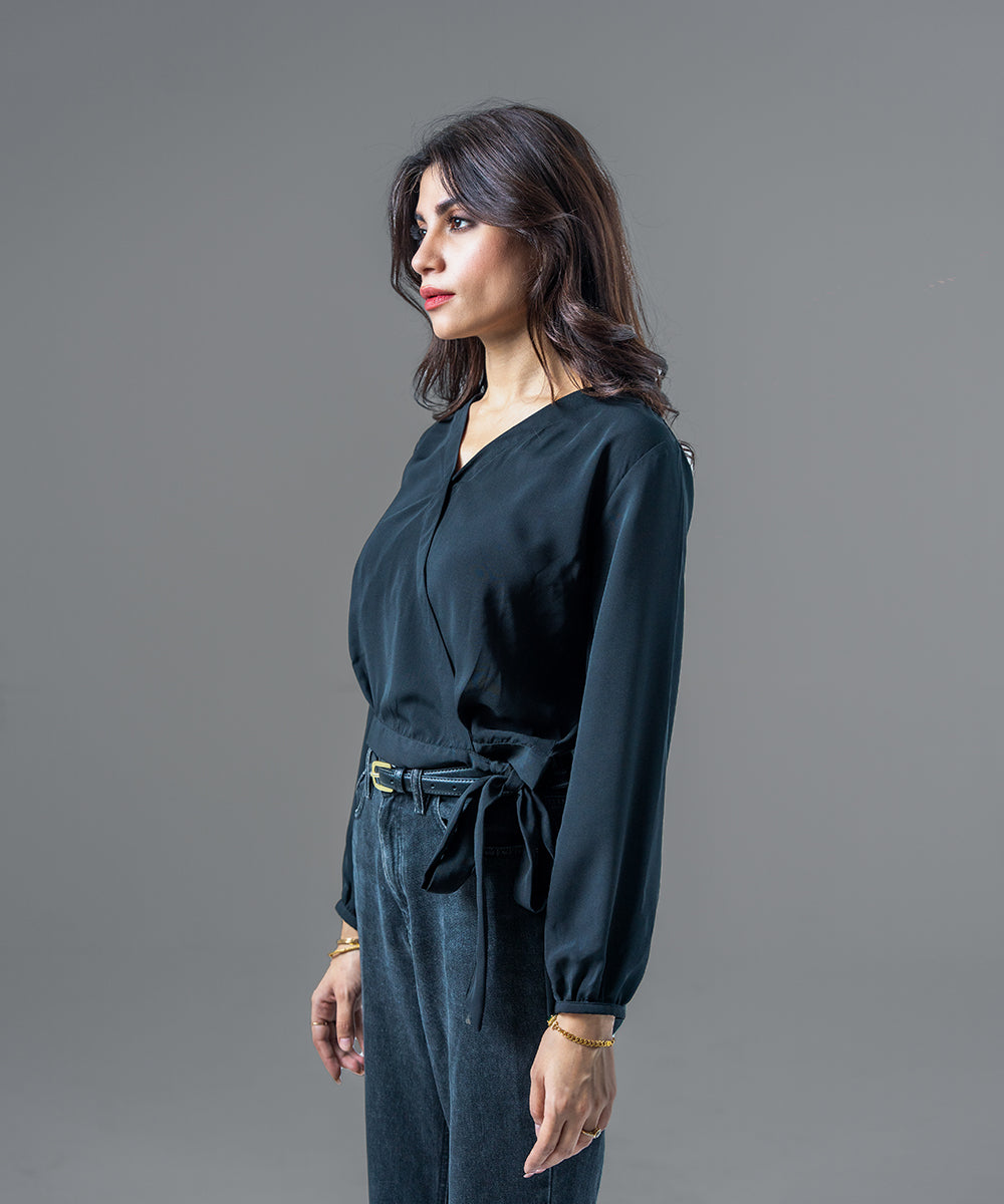 Design details: Crafted in sheer georgette, this black crop top cinches at the waist with a chic tie detail.