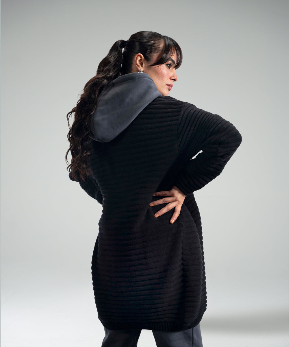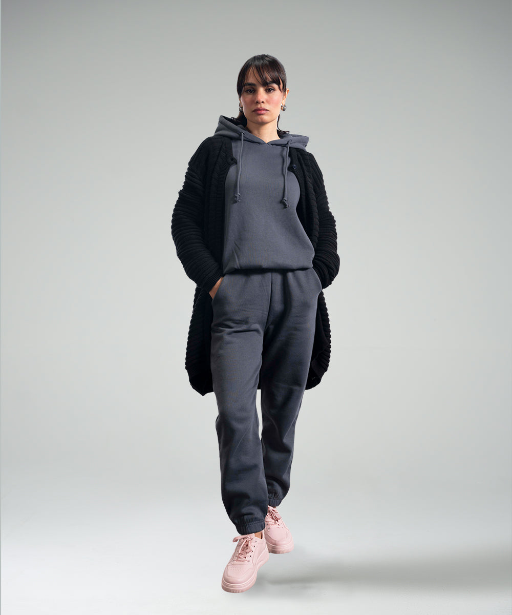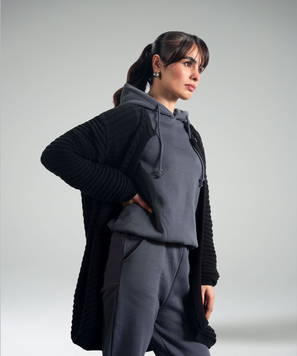 Design details: The charcoal front-open sweater, made from beautifully knitted fabric, offers an elegant and cozy appeal. Its refined texture enhances its stylish and versatile look