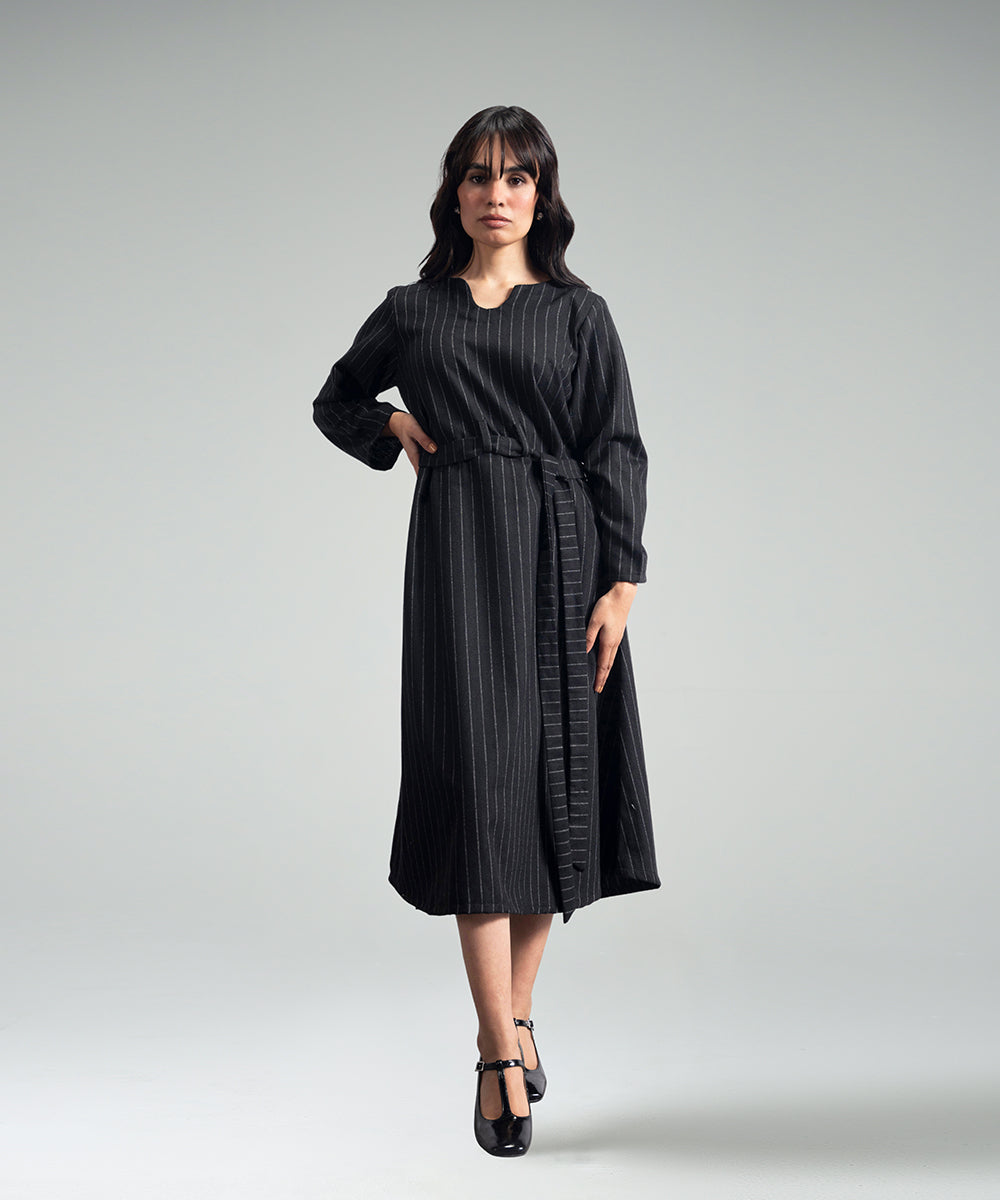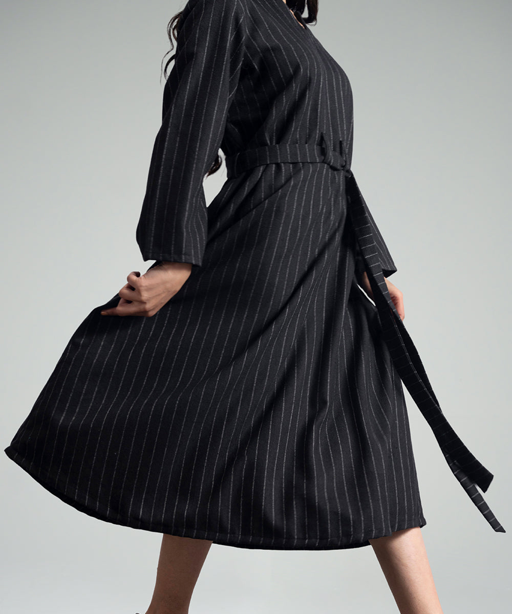 Design details: Woollen wrap dress, a masterful fusion of style and sophistication. Delicate folds envelop your silhouette, framing a tantalizing keyhole neckline and flowing sleeves that cascade like winter's gentle snowfall. A dramatic flare swirls at the hem, and a perfectly placed belt cinches at your waist.