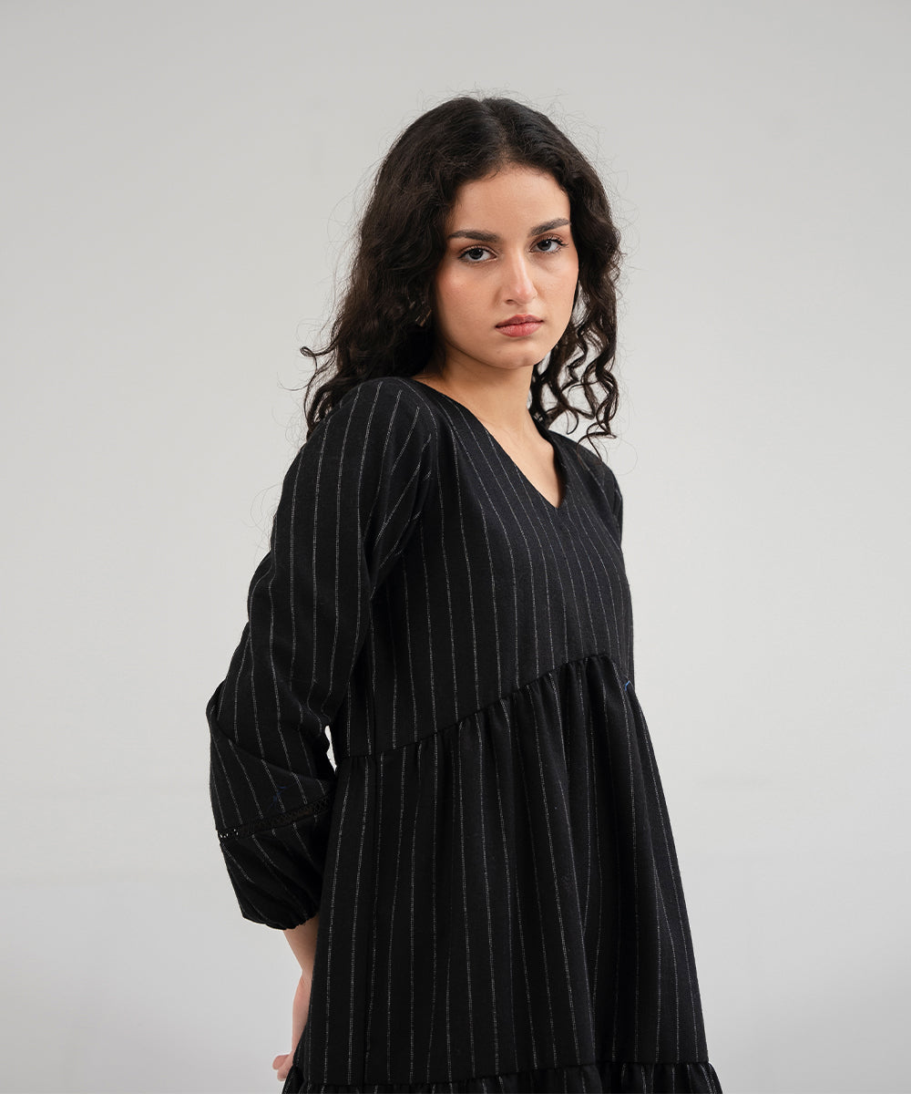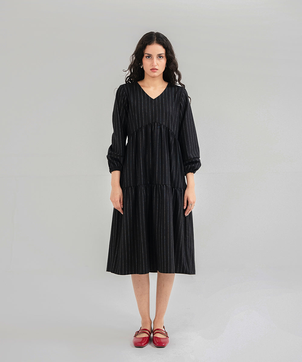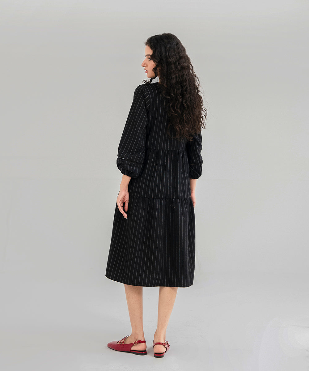 Design details: Three-layered knee-length dress, crafted from luxurious woolen fabric. This elegant design showcases, A sleek V-shaped neckline, spacious bishop sleeves for dramatic bounce and a good flared hem.