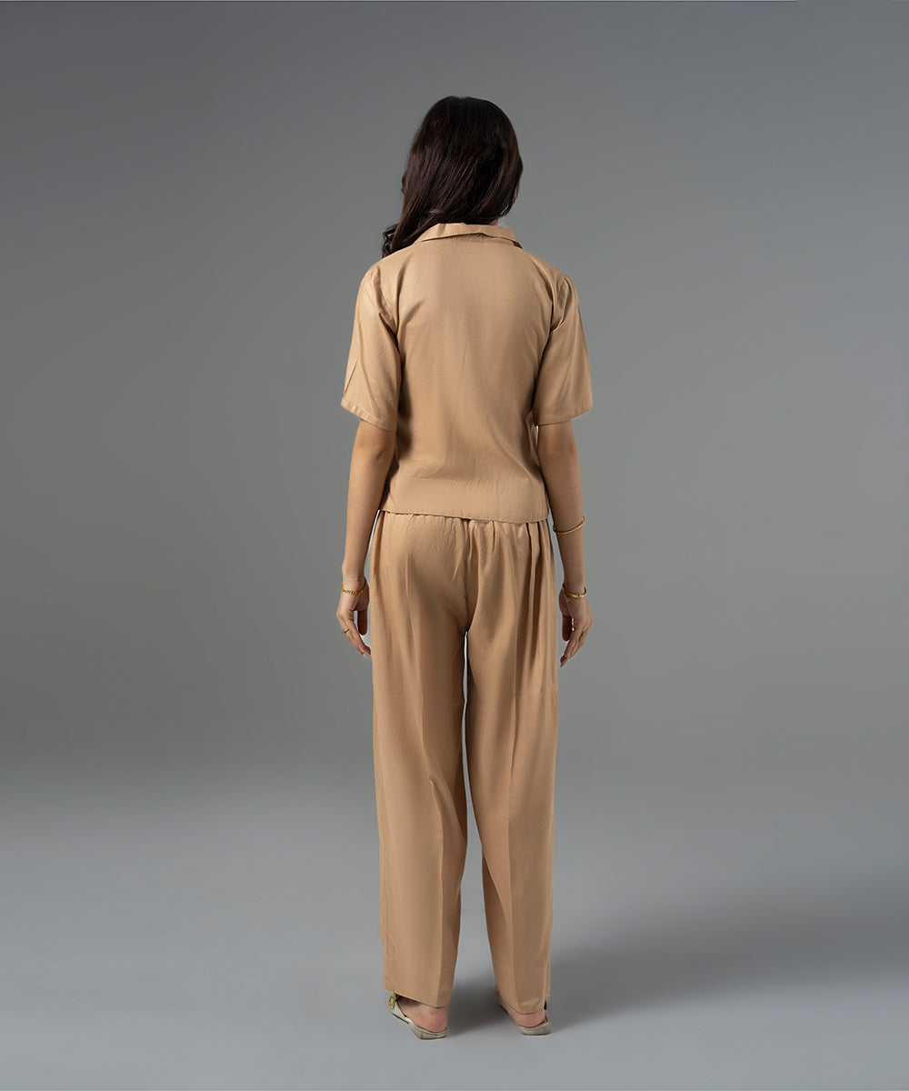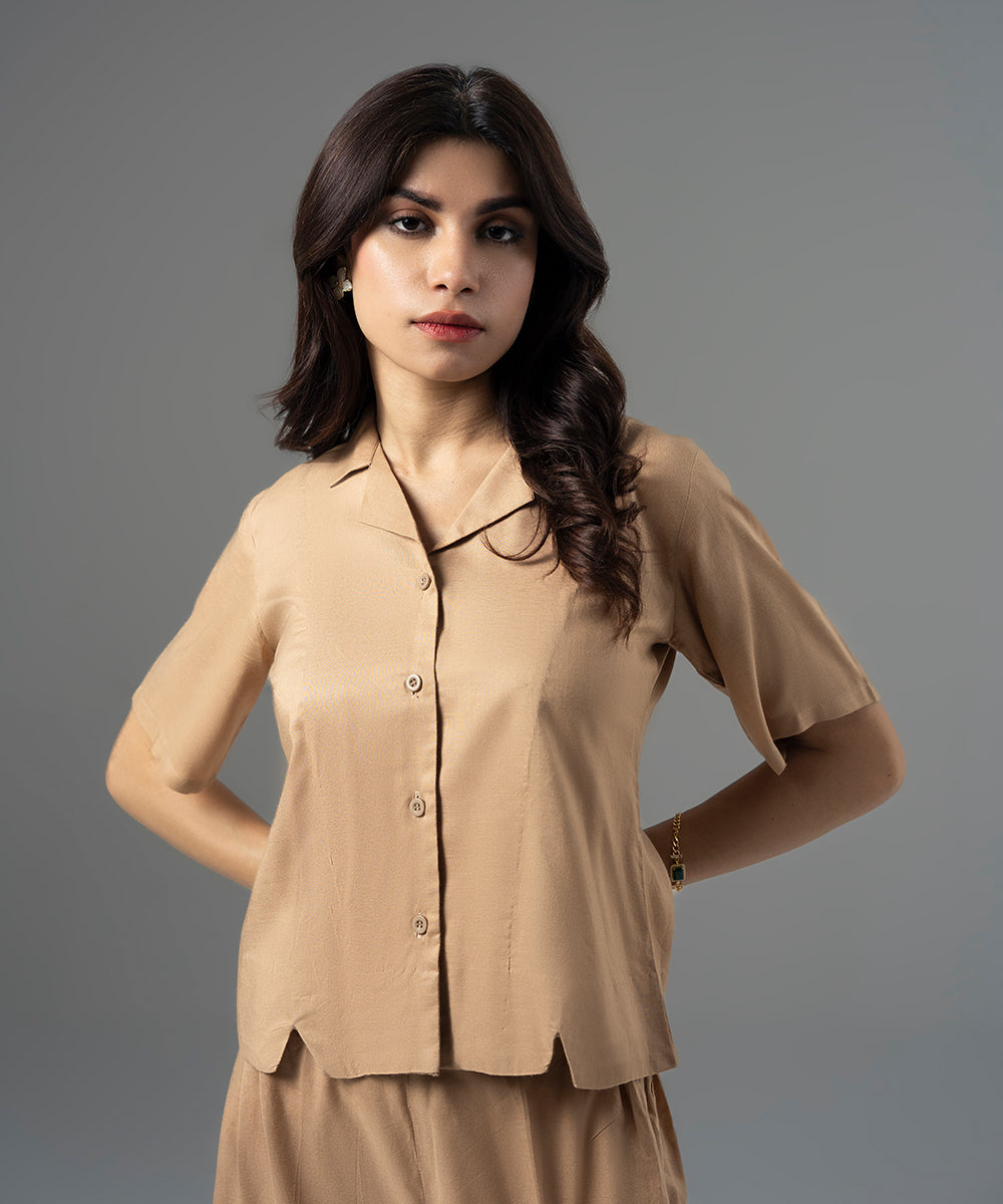 Design details: A mustard brown Cuban-collar shirt, shorter in length and tailored for a fitted look.