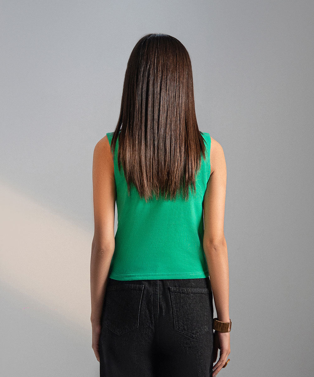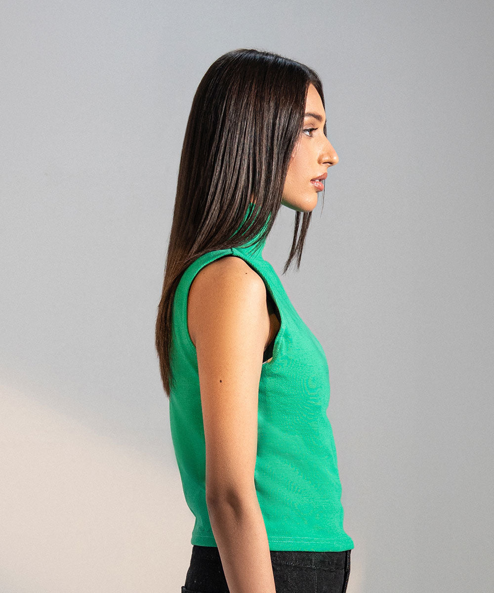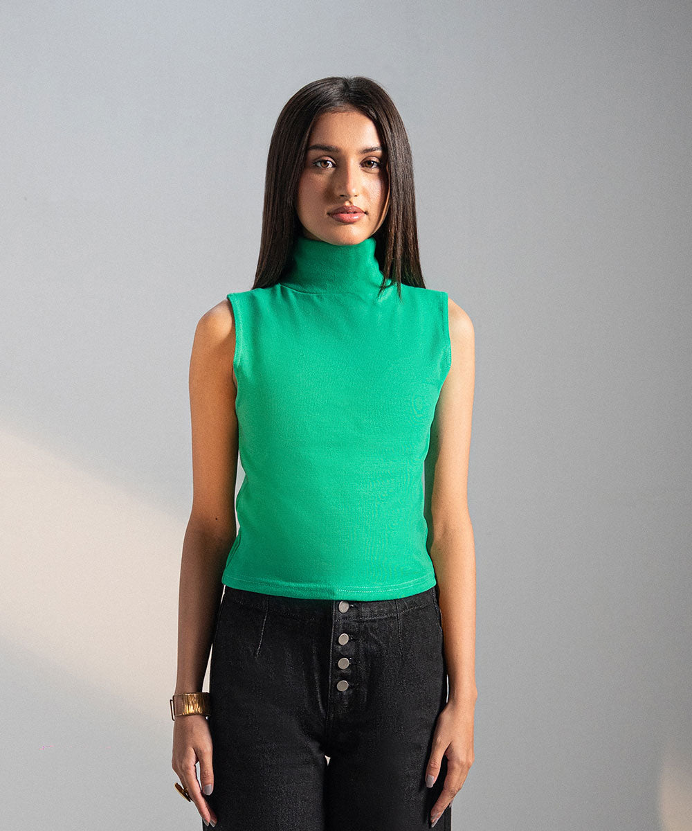 Design details: Soft green ribbed top with classic turtle neck, slim fit, and clean lines.