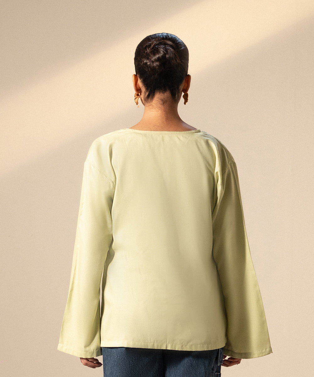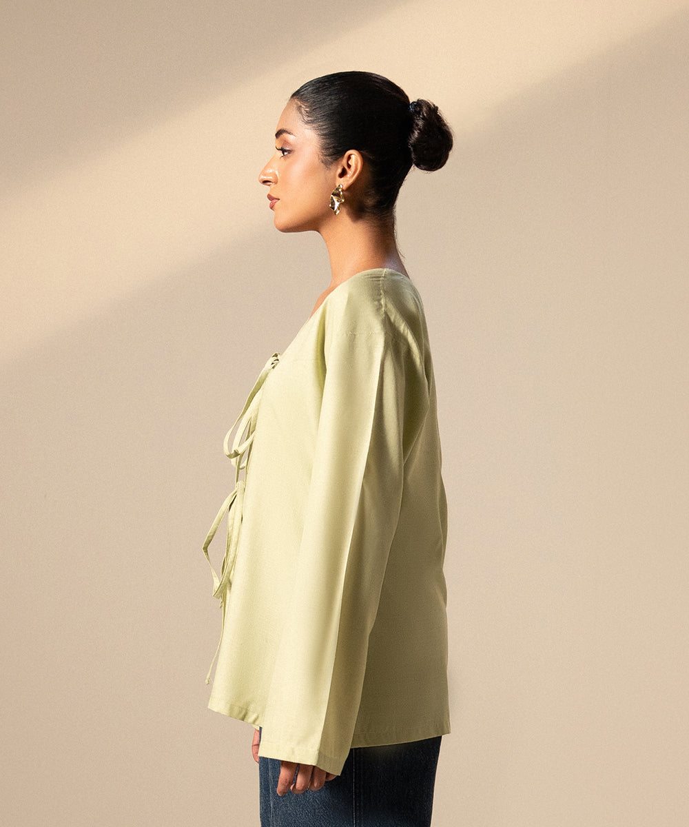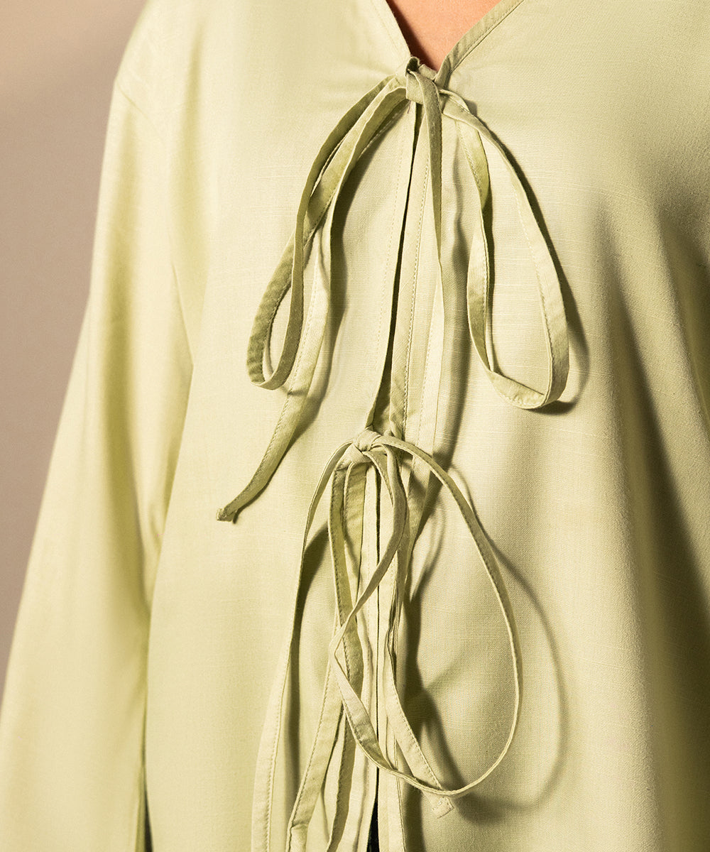 Design details: A light sage top with a relaxed fit and a playful self-tie knot closure down the center front.