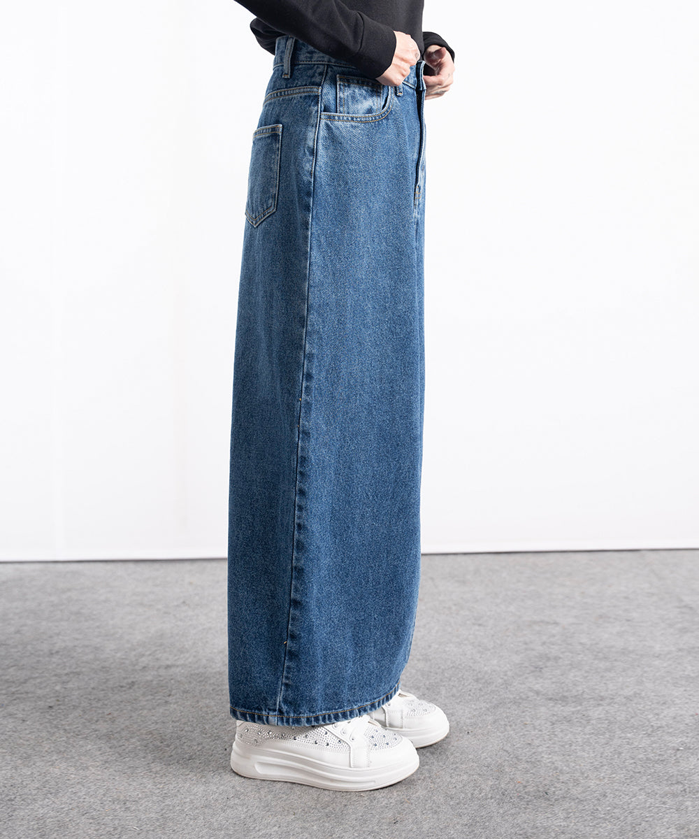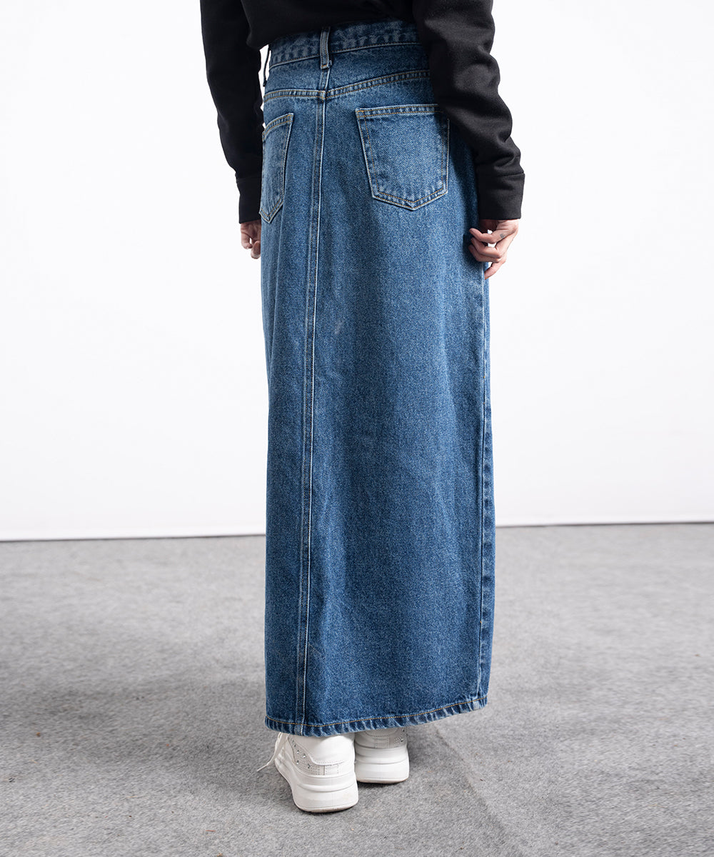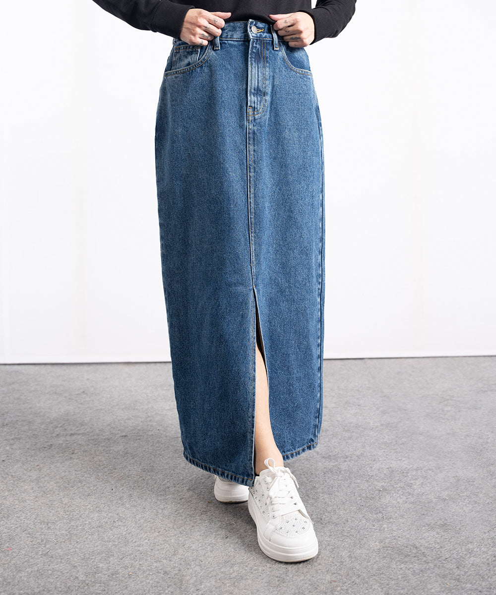 It's a light wash modern, knee-length denim skirt streamlined silhouette with a skin-fit design, featuring a front slit for added flair and movement.