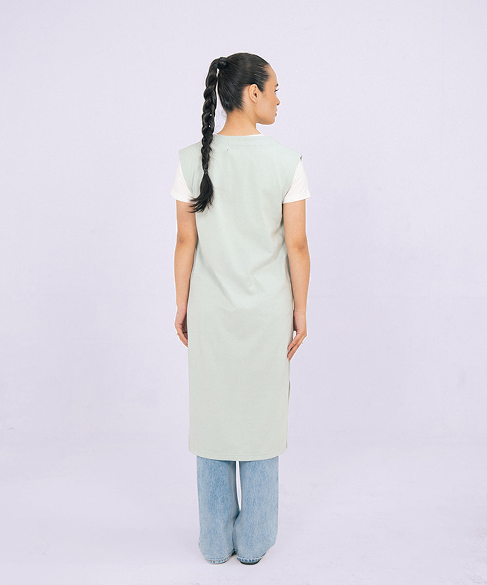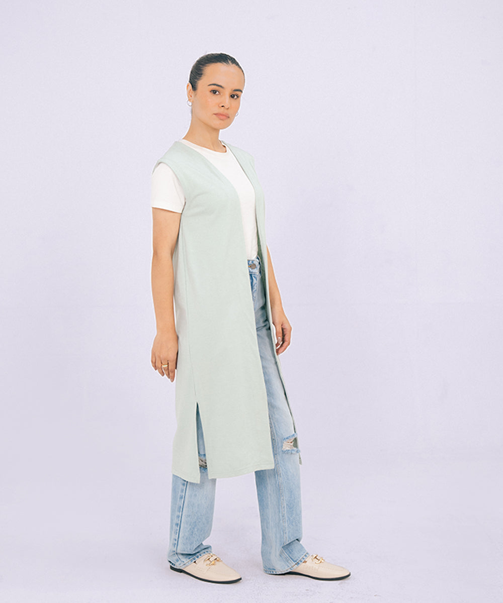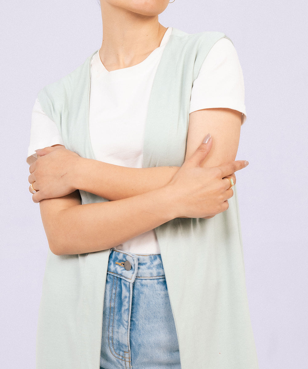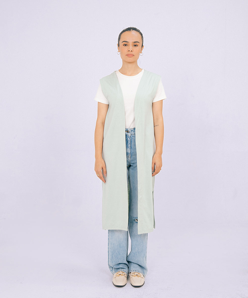 A lightweight white jersey cardigan with a soft, breathable feel. Its sleeveless design offers a stylish and comfortable fit, perfect for layering over any outfit