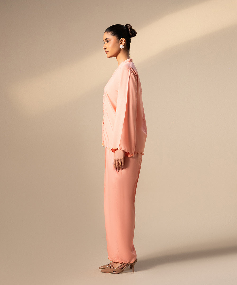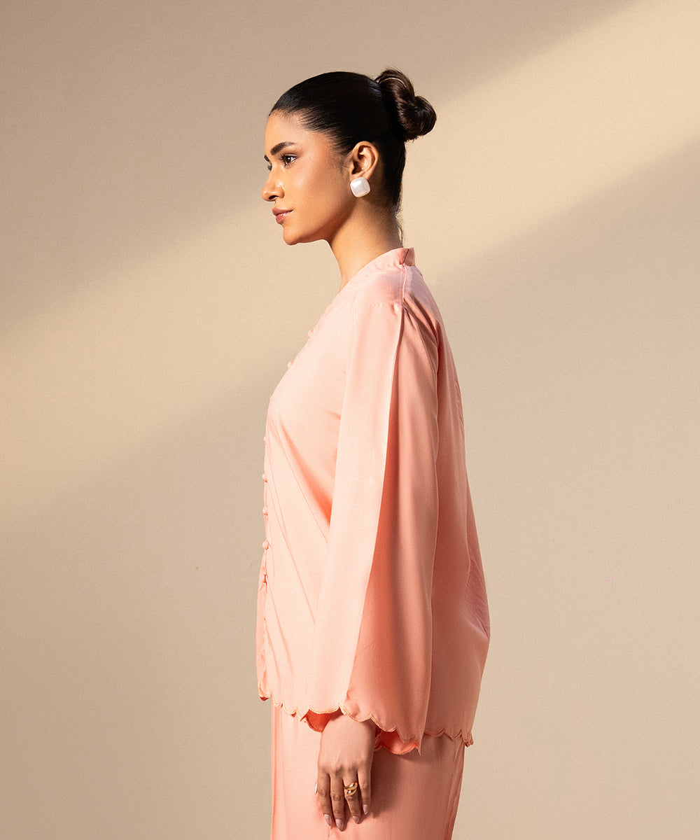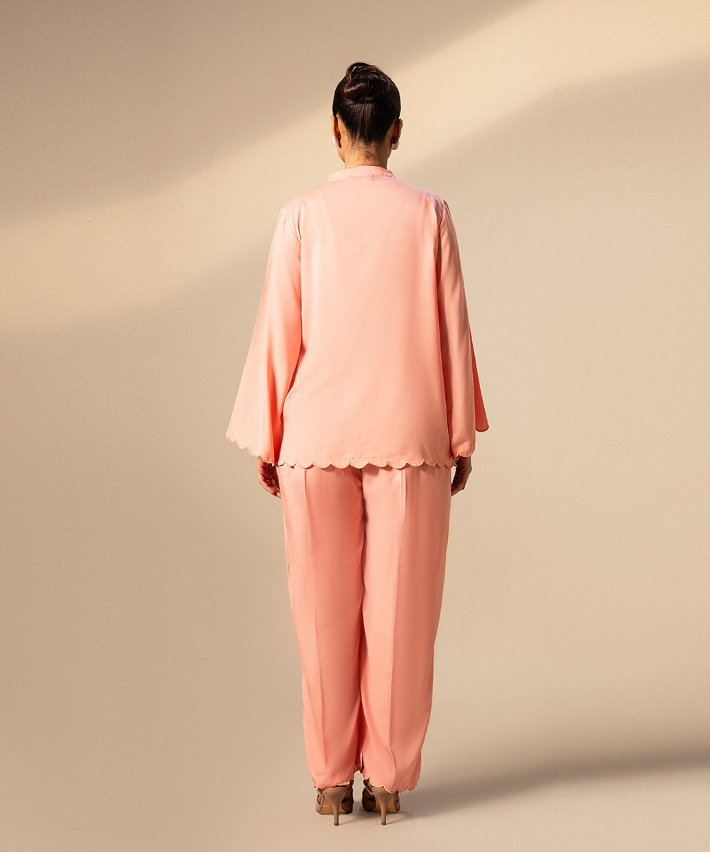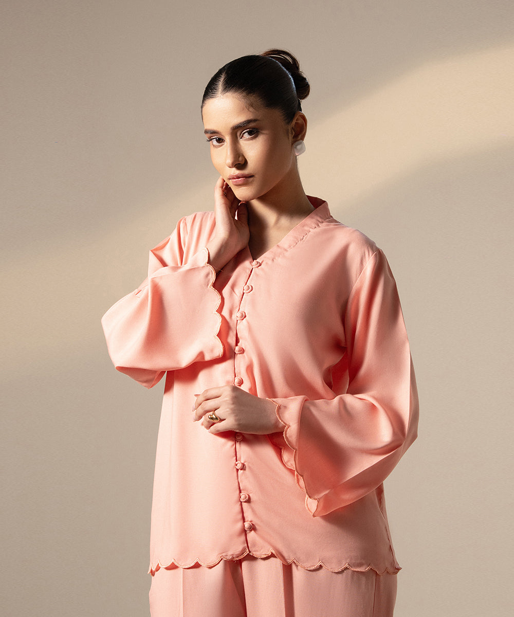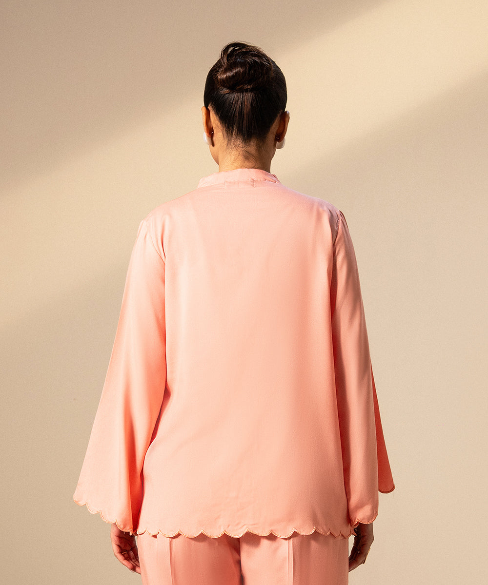Design details: An elegant, soft pink button-down shirt featuring a delicate scalloped placket and matching scalloped edges along the hem and the wide, flared cuffs.