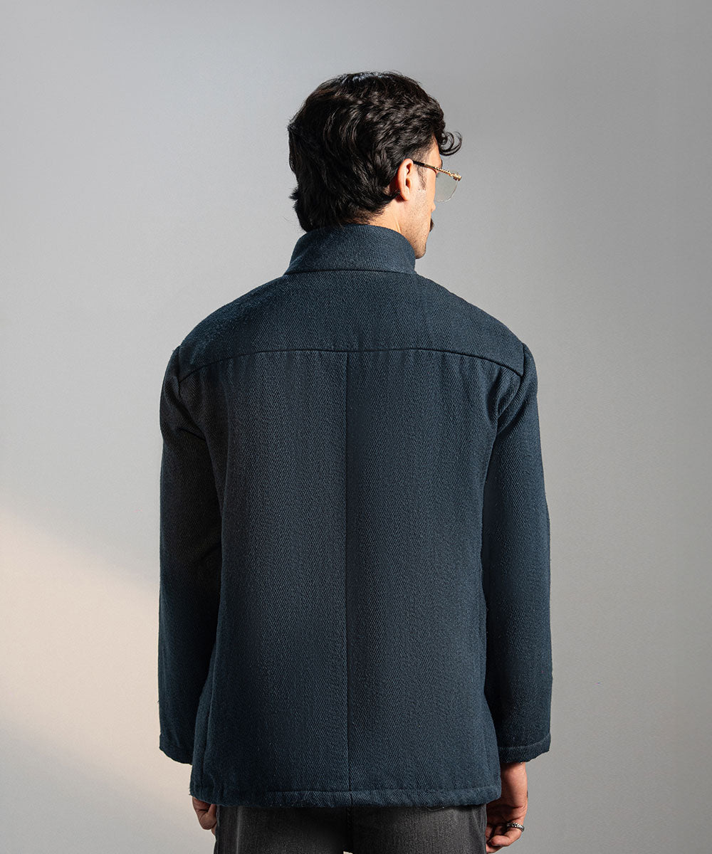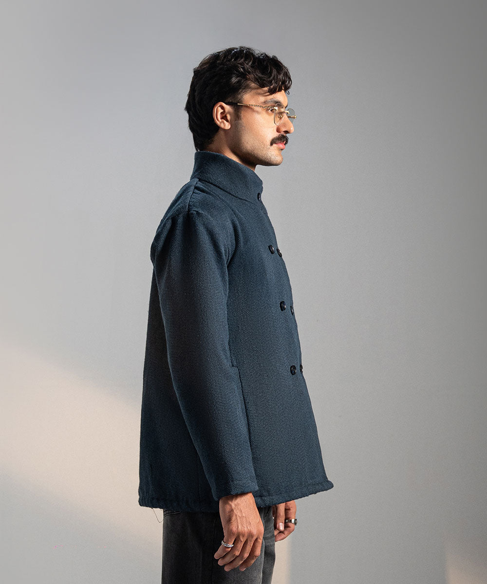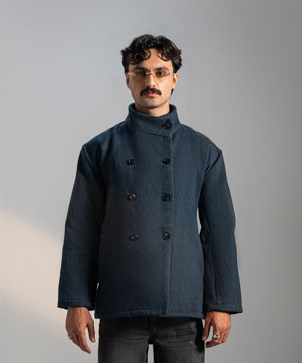 Design details: Classic Midnight Fold men’s coat crafted in rich blue wool with structured, polished style.
