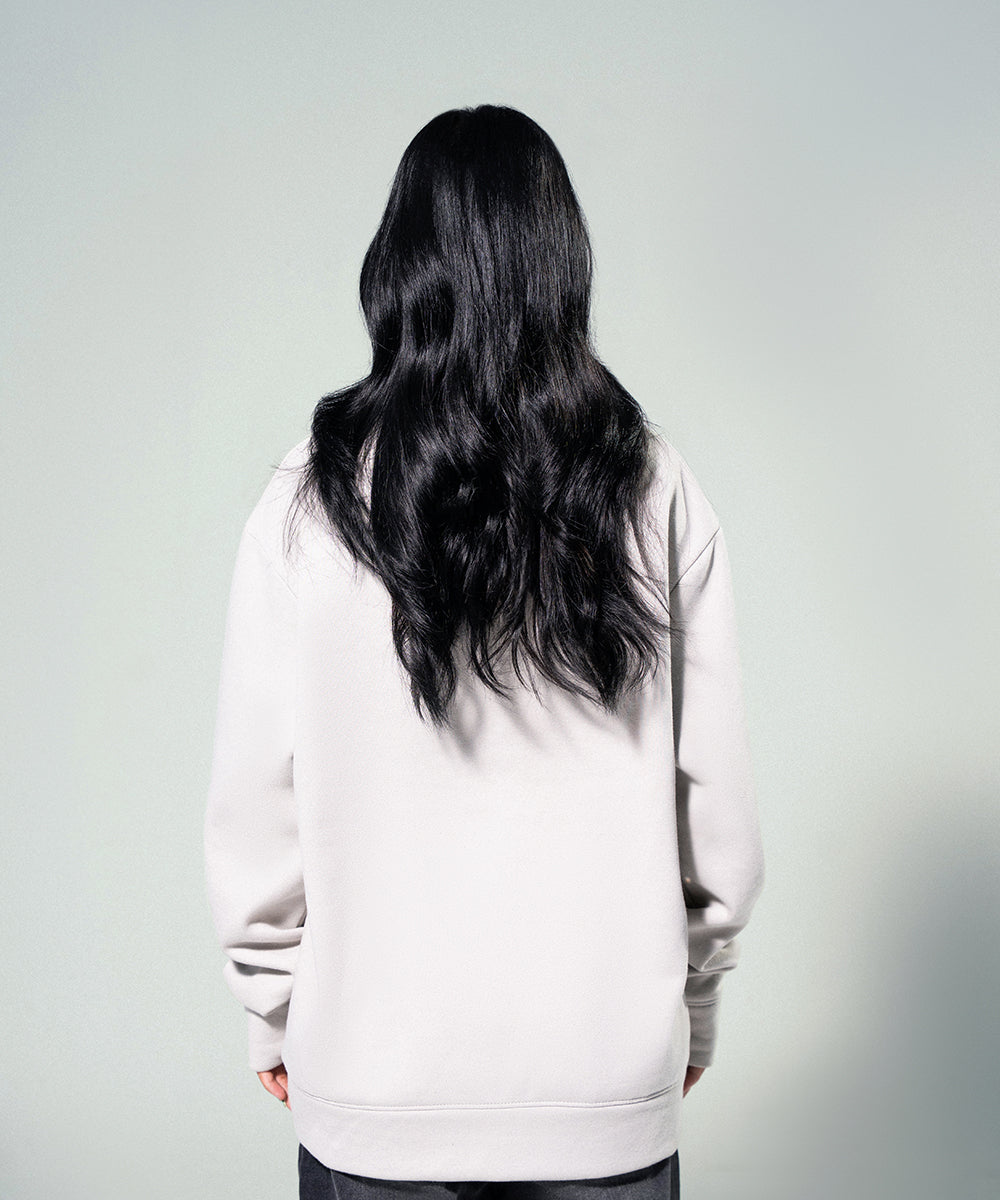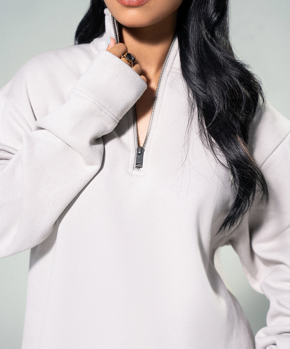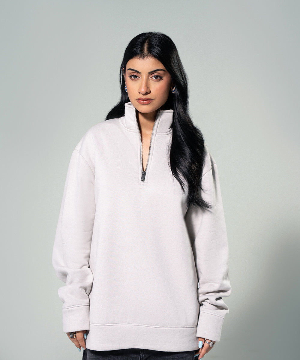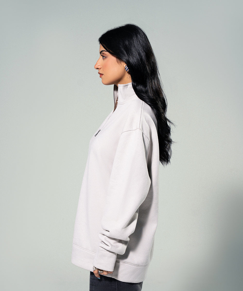Design details: Off-white mock neck zip shirt with a sleek, modern silhouette and soft texture perfect for refined comfort and everyday layering.
