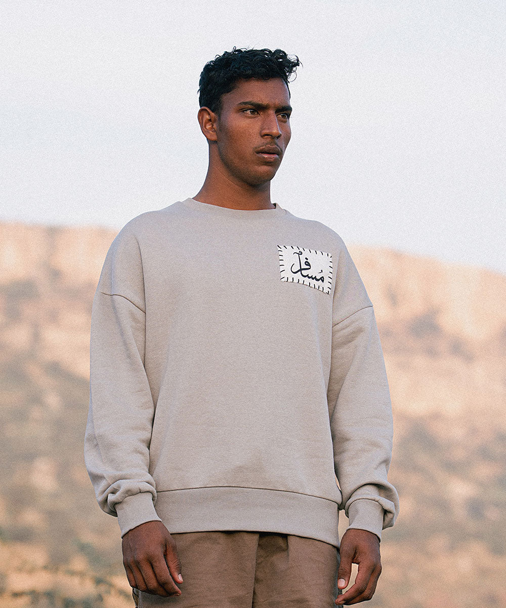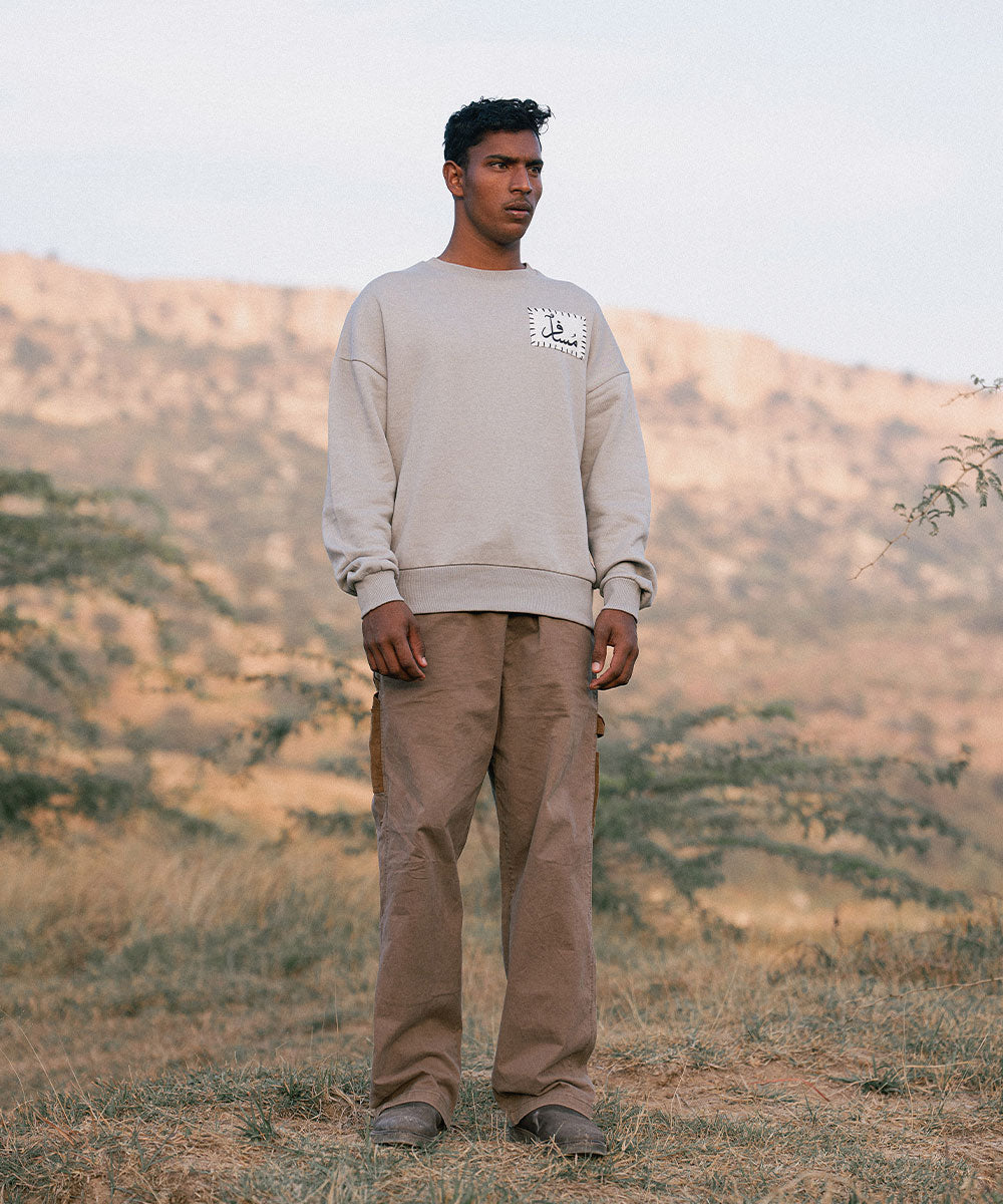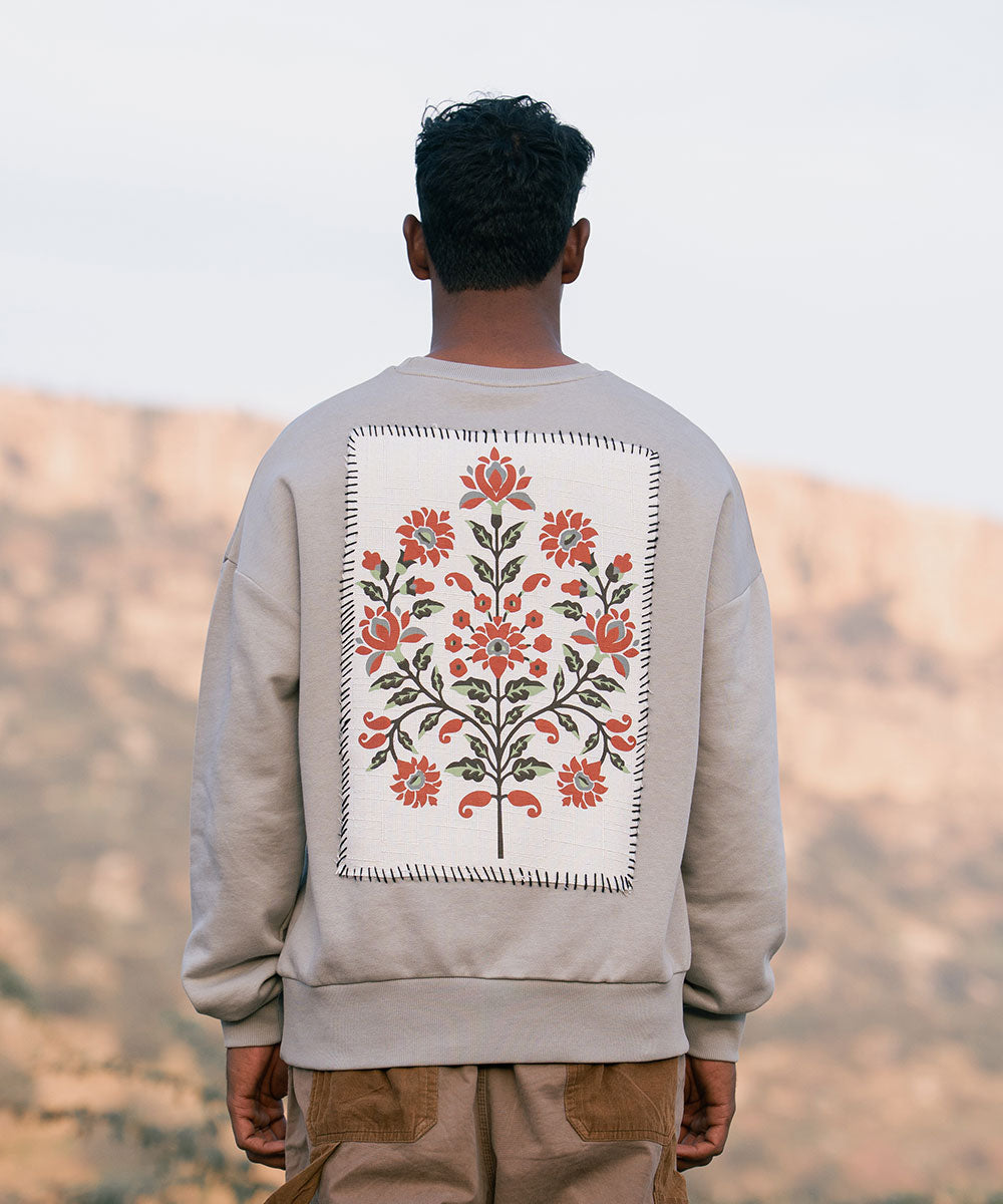 Design details: Minimal, cozy sweatshirt with “Naqsh” detailing, adorned with artisanal floral block printing.