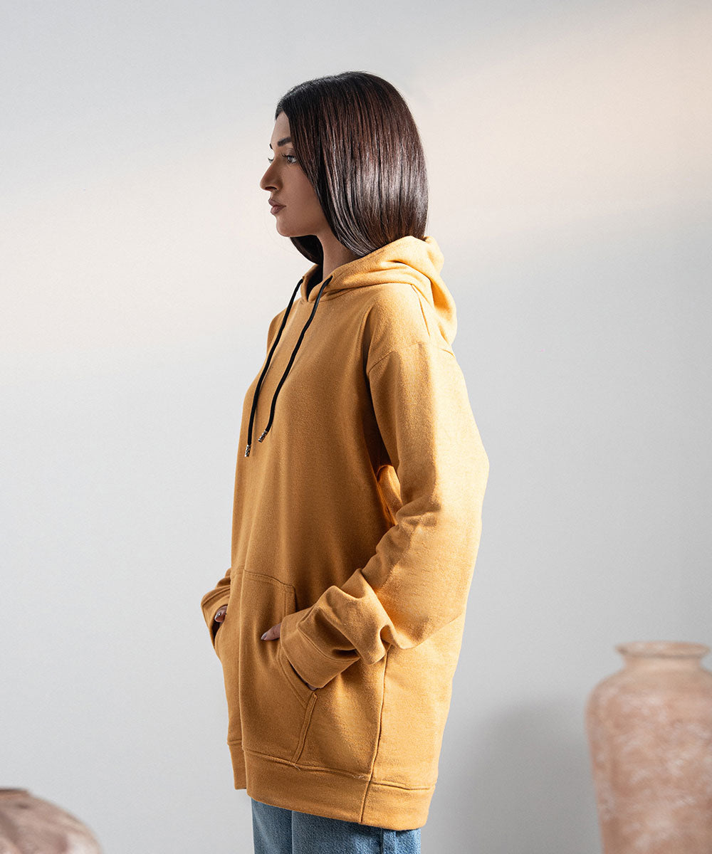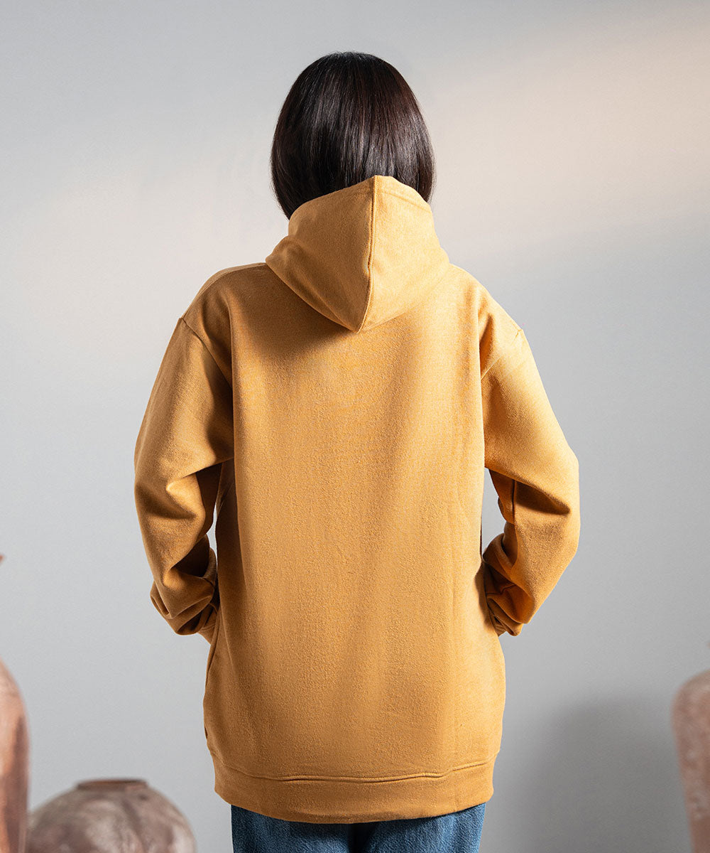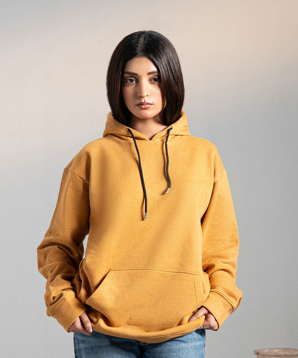 Design details: Vibrant mustard hoodie with soft fleece interior, adjustable hood, and relaxed, comfortable fit.
