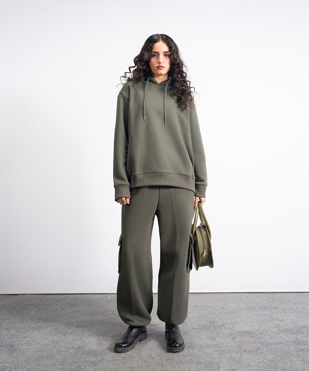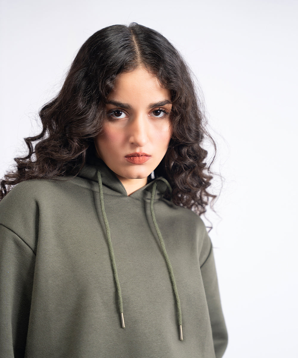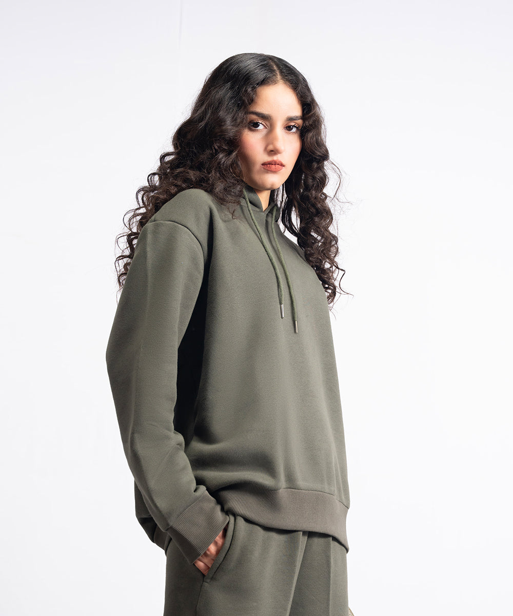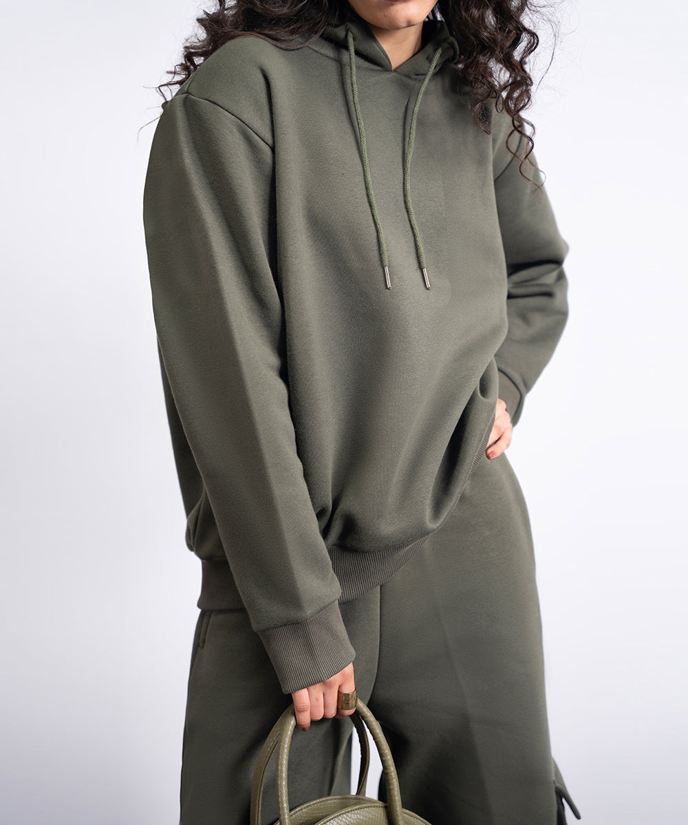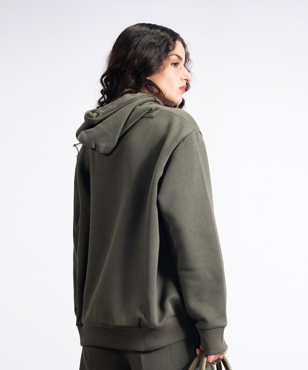 An oversized olive green fleece hoodie, offering a cozy and relaxed fit. It features a hood with a cap for added style and warmth, perfect for casual, comfortable wear.