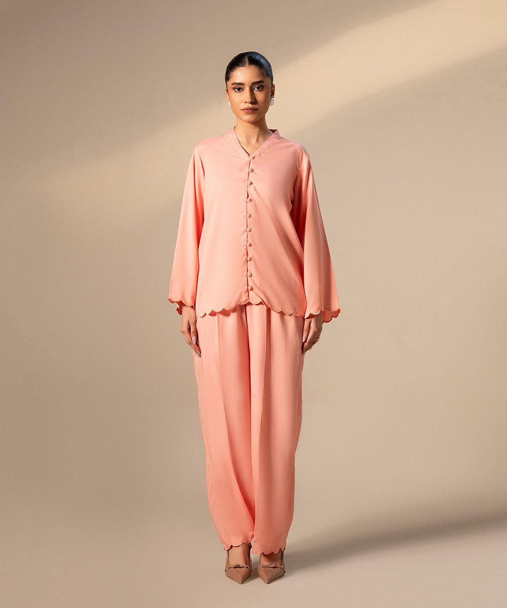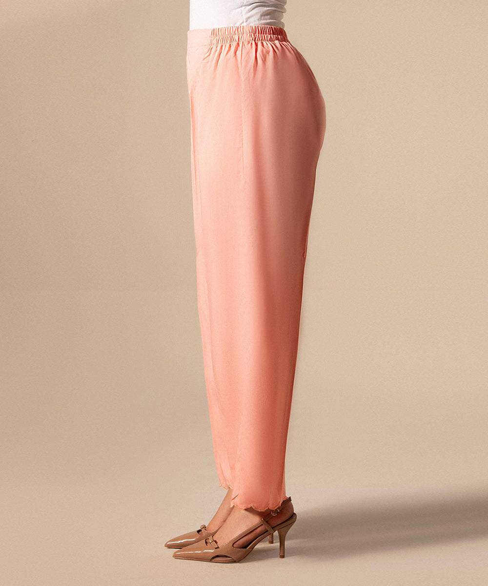 Design details: Tailored trousers in the same soft pink shade, designed to perfectly match the Scalloped Placket Blouse for a polished, monochromatic look.