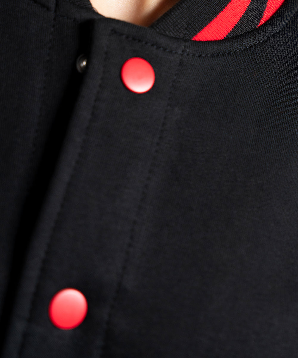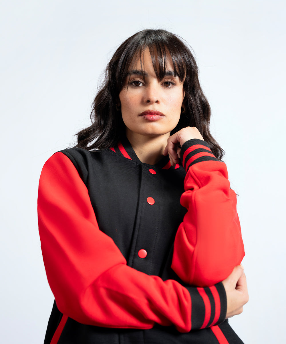Elevate your streetwear style with our Black Varsity Jacket featuring bold red sleeves. This classic jacket combines retro varsity vibes with a modern twist, making it a versatile addition to your wardrobe.