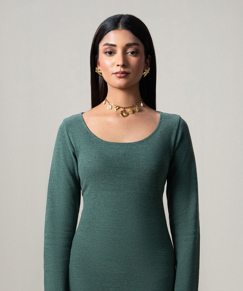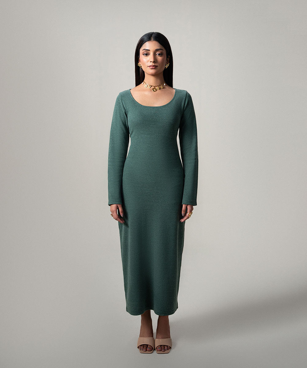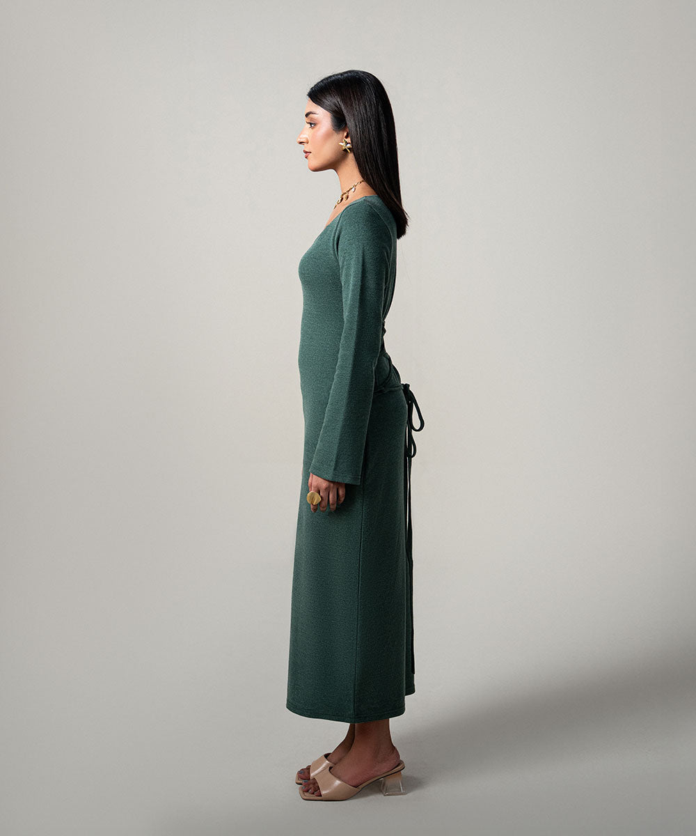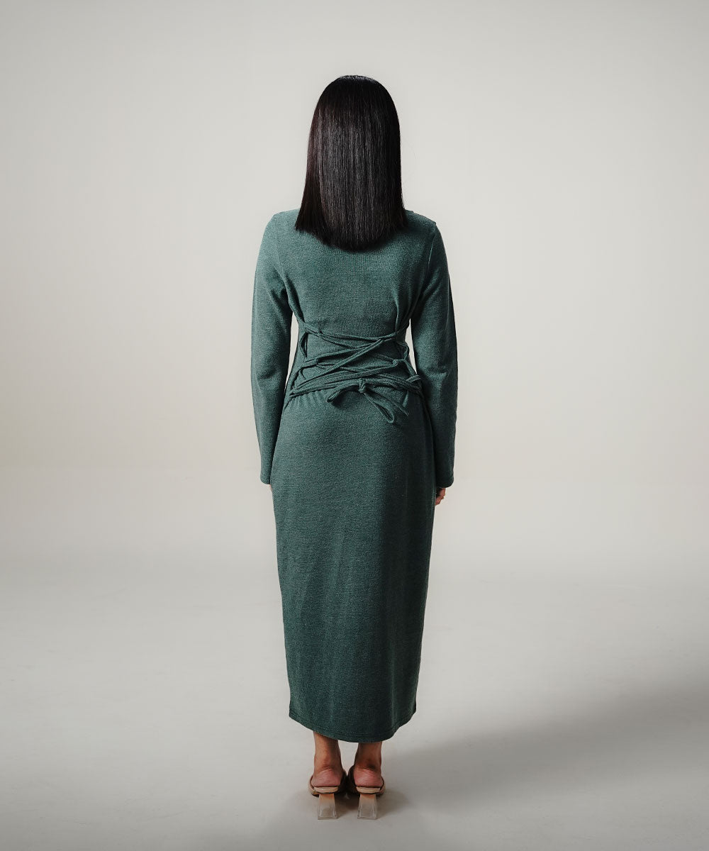 Design details: Tailored green back rib corset dress with lace panel and refined, structured silhouette.