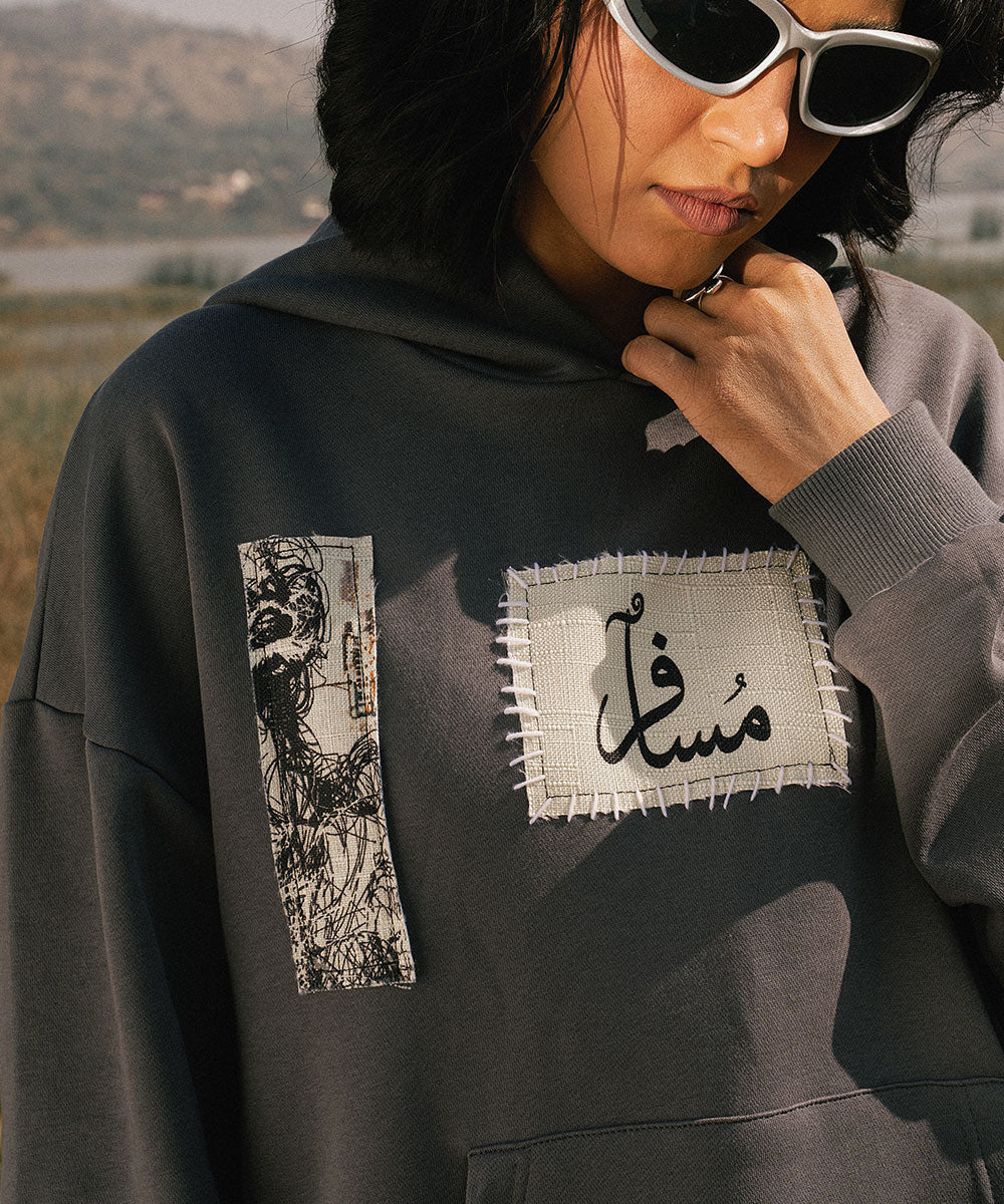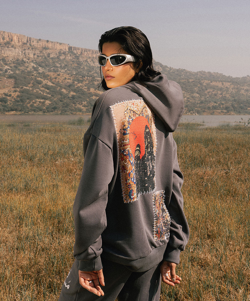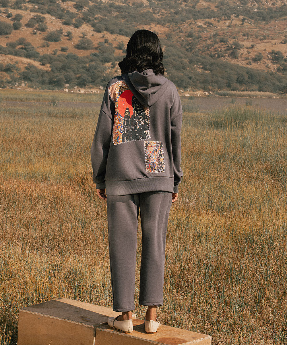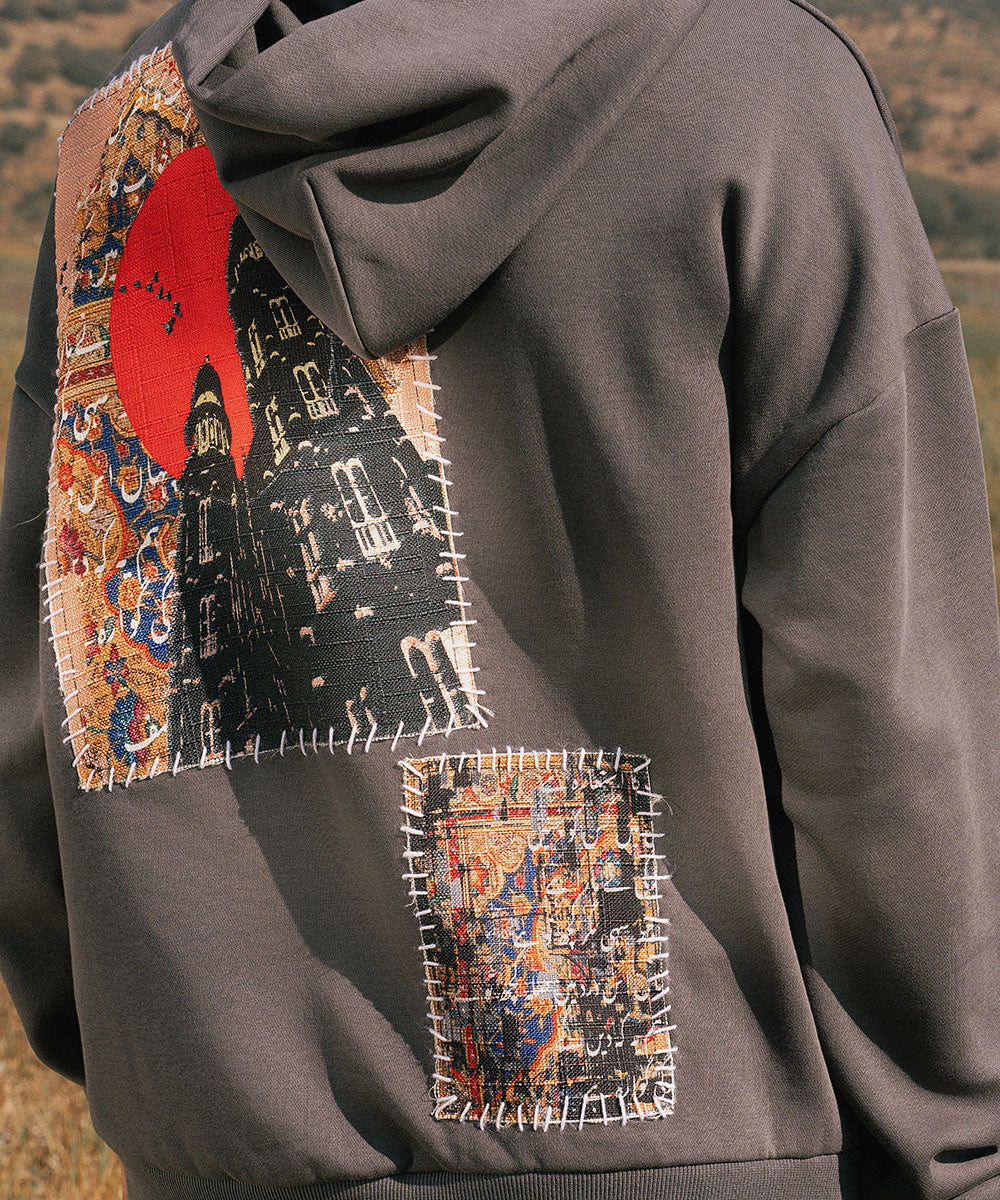 Design details: Soft grey fleece hoodie with screen printed patchwork panels that resemble collected fragements of journey. Patches appear with visible stitch like borders symbolizing stitching past into their present.