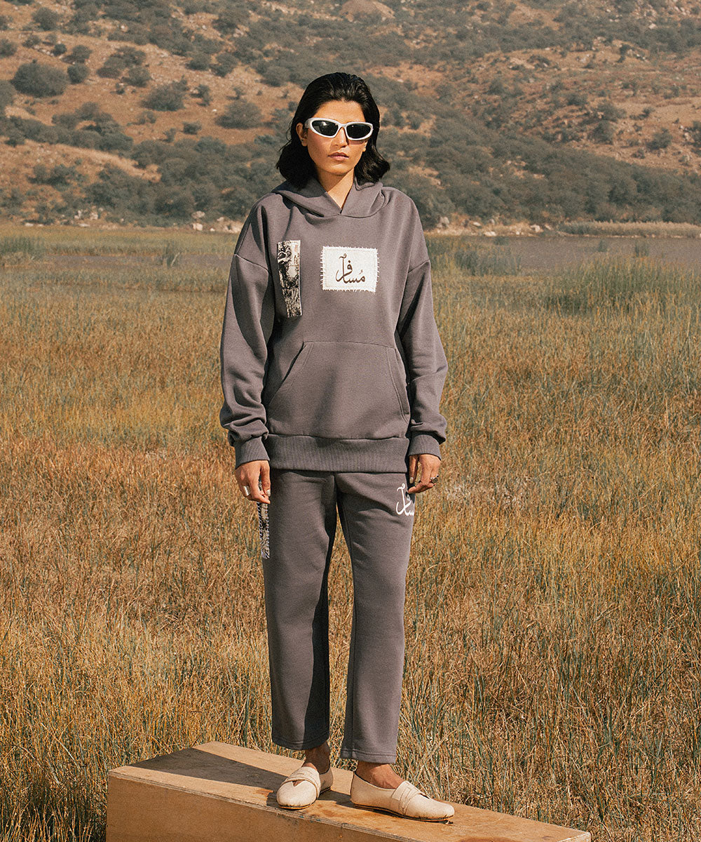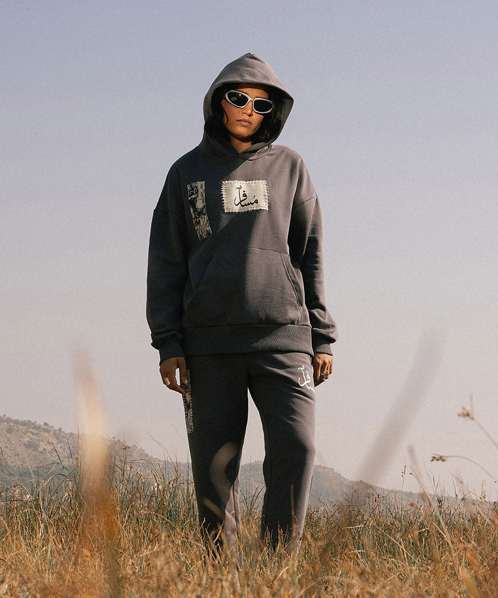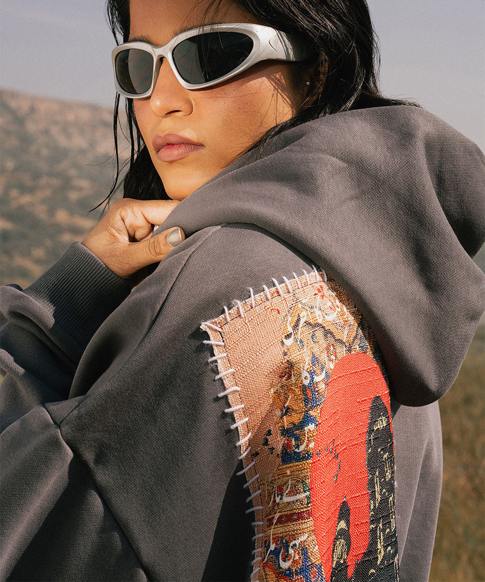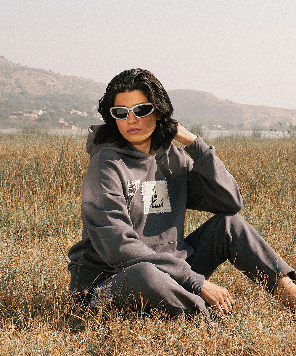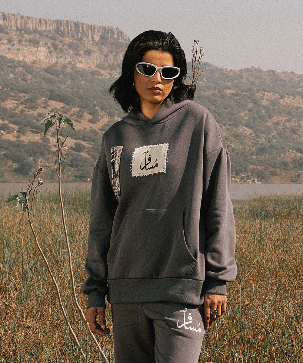 Design details: Soft grey fleece hoodie with screen printed patchwork panels that resemble collected fragements of journey. Patches appear with visible stitch like borders symbolizing stitching past into their present.