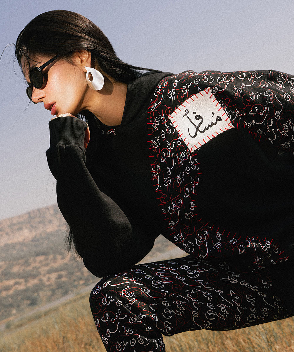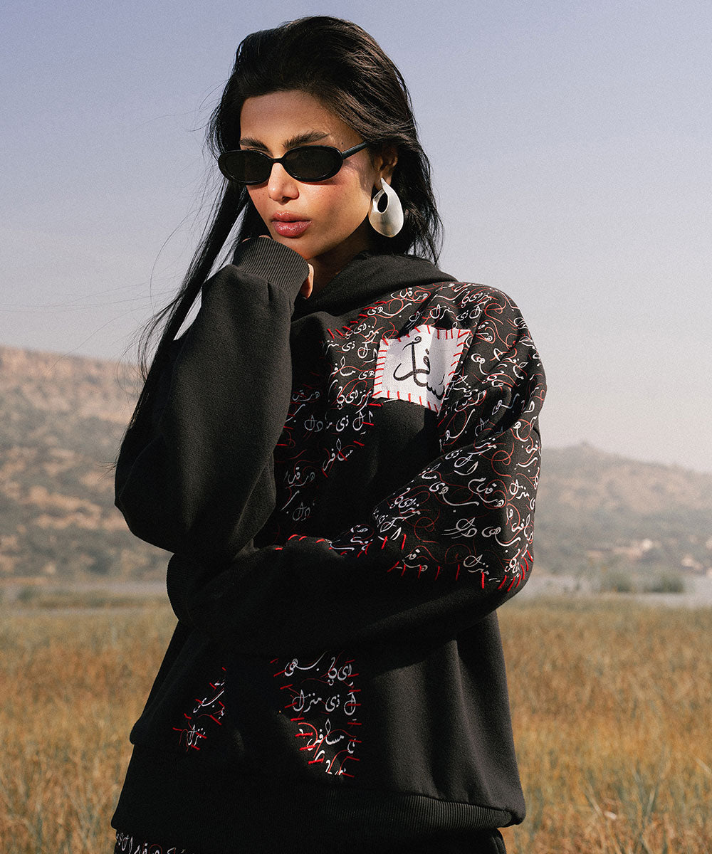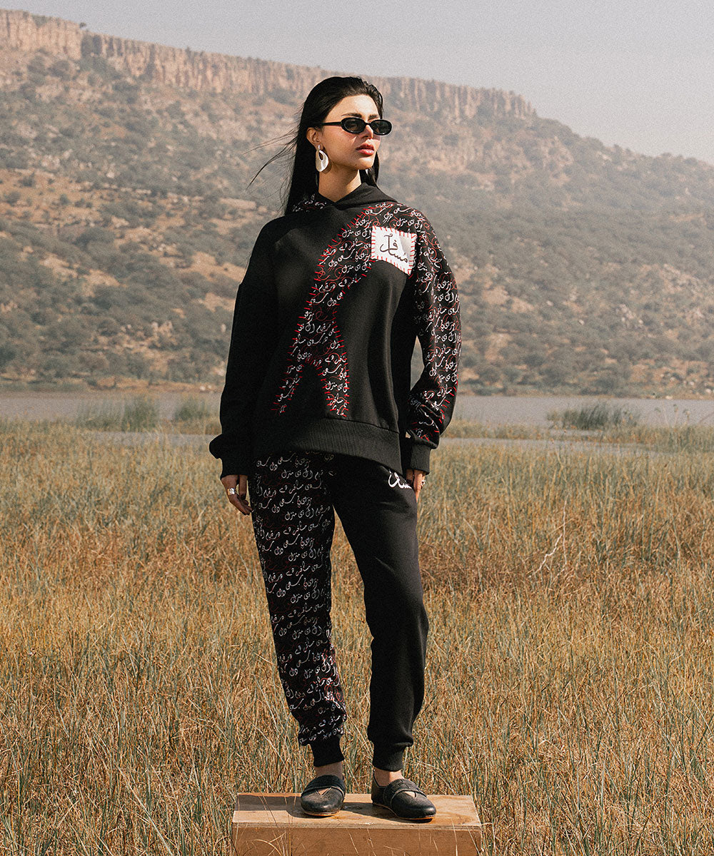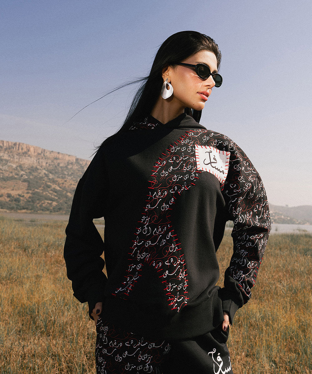 Design details: Soft black hoodie capturing the beauty of paths carved in silence and intention.