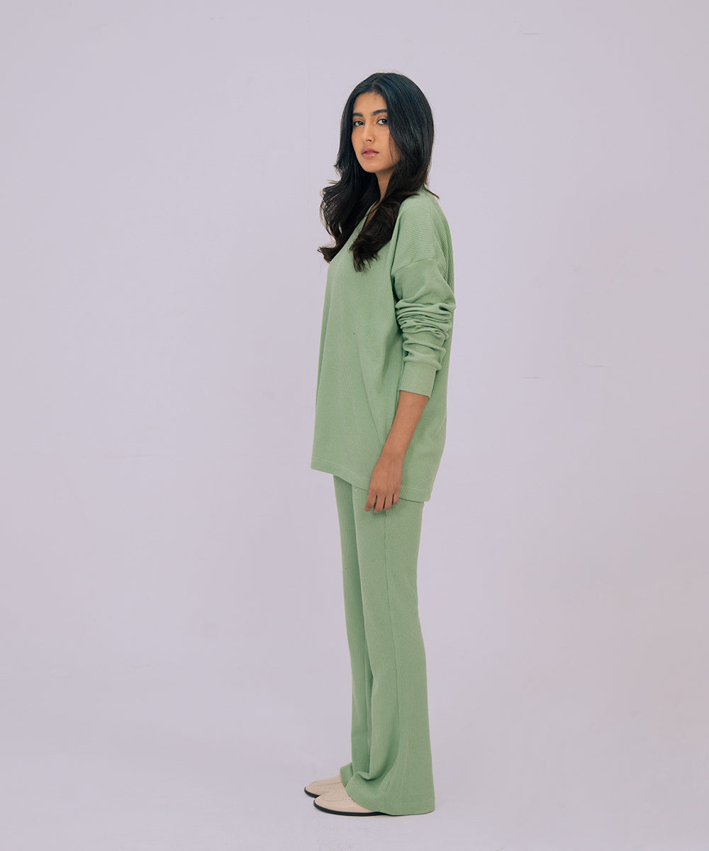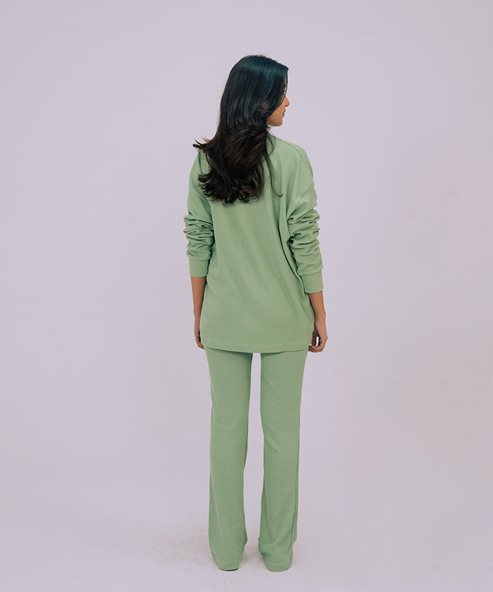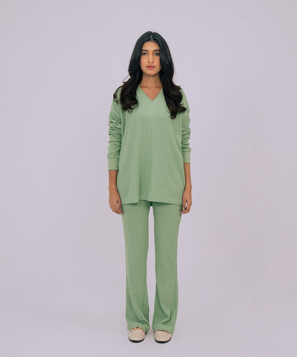 A chic green thermal V-neck top designed for both warmth and style. The sleek silhouette and soft fabric make it a perfect choice for cozy yet fashionable wear.