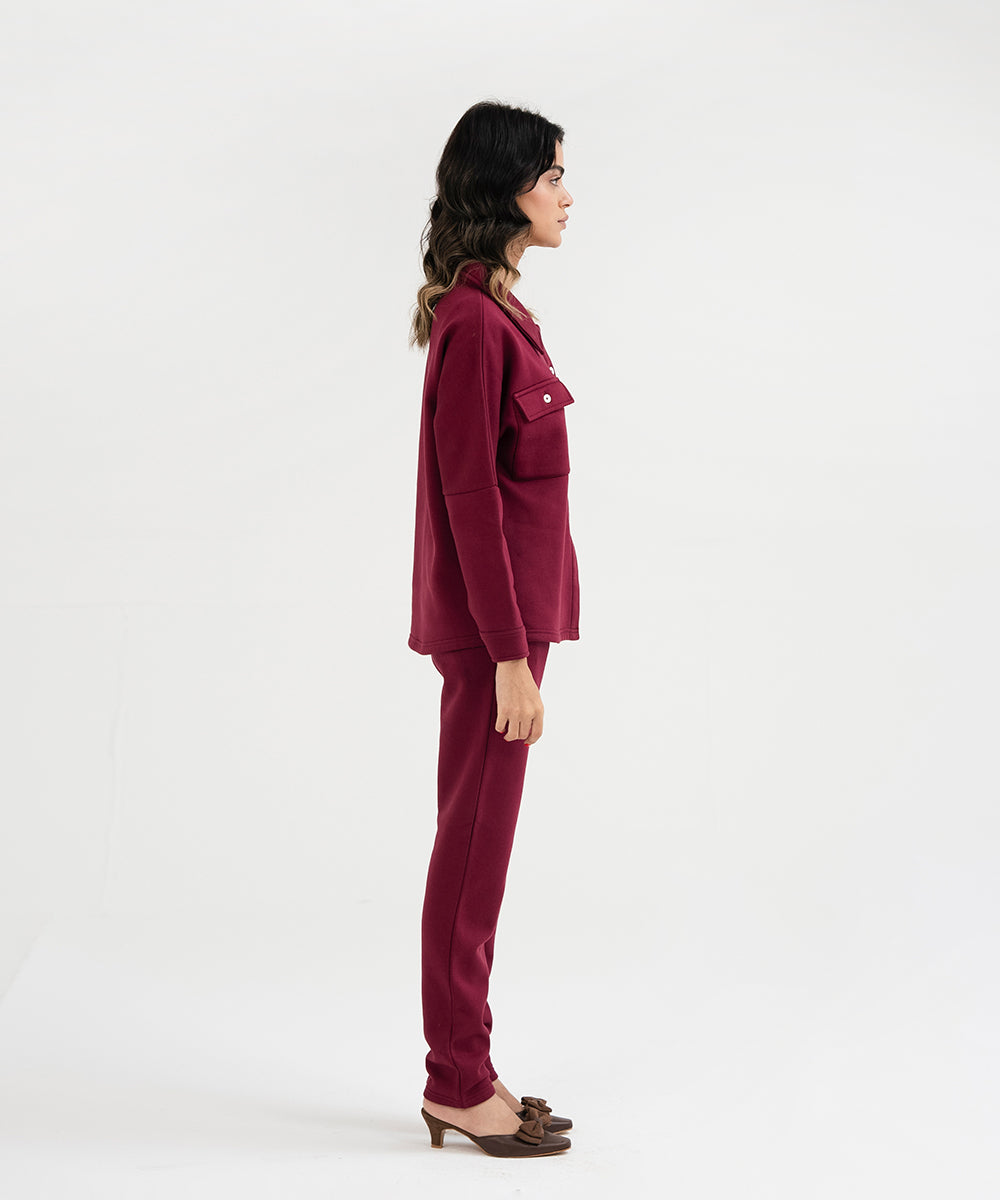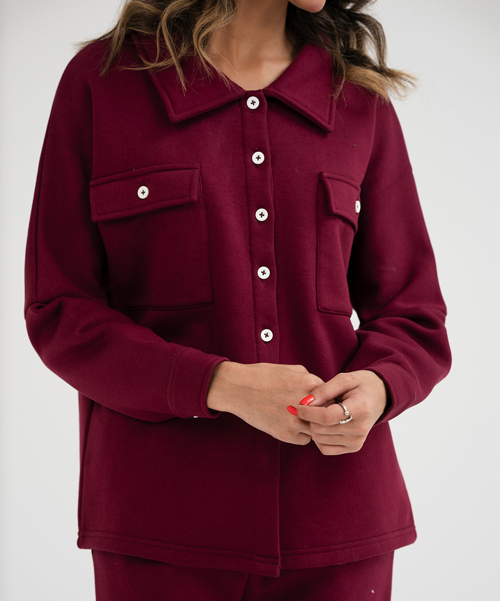 A cozy wine-red fleece button-down top with drop shoulders, front flap pockets, and contrasting white buttons for easy closure. Features cuffed sleeves with button details, blending style with functionality. Pair with matching wine colored trousers to complete the look.